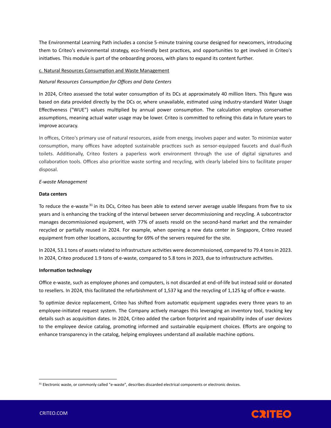 CRITEO.COM The Environmental Learning Path includes a concise 5-minute training course designed for newcomers, introducing them to Criteo's environmental strategy, eco-friendly best practices, and opportunities to get involved in Criteo's initiatives. This module is part of the onboarding process, with plans to expand its content further. c. Natural Resources Consumption and Waste Management Natural Resources Consumption for Offices and Data Centers In 2024, Criteo assessed the total water consumption of its DCs at approximately 40 million liters. This figure was based on data provided directly by the DCs or, where unavailable, estimated using industry-standard Water Usage Effectiveness ("WUE") values multiplied by annual power consumption. The calculation employs conservative assumptions, meaning actual water usage may be lower. Criteo is committed to refining this data in future years to improve accuracy. In offices, Criteo's primary use of natural resources, aside from energy, involves paper and water. To minimize water consumption, many offices have adopted sustainable practices such as sensor-equipped faucets and dual-flush toilets. Additionally, Criteo fosters a paperless work environment through the use of digital signatures and collaboration tools. Offices also prioritize waste sorting and recycling, with clearly labeled bins to facilitate proper disposal. E-waste Management Data centers To reduce the e-waste3 0F 31 in its DCs, Criteo has been able to extend server average usable lifespans from five to six years and is enhancing the tracking of the interval between server decommissioning and recycling. A subcontractor manages decommissioned equipment, with 77% of assets resold on the second-hand market and the remainder recycled or partially reused in 2024. For example, when opening a new data center in Singapore, Criteo reused equipment from other locations, accounting for 69% of the servers required for the site. In 2024, 53.1 tons of assets related to infrastructure activities were decommissioned, compared to 79.4 tons in 2023. In 2024, Criteo produced 1.9 tons of e-waste, compared to 5.8 tons in 2023, due to infrastructure activities. Information technology Office e-waste, such as employee phones and computers, is not discarded at end-of-life but instead sold or donated to resellers. In 2024, this facilitated the refurbishment of 1,537 kg and the recycling of 1,125 kg of office e-waste. To optimize device replacement, Criteo has shifted from automatic equipment upgrades every three years to an employee-initiated request system. The Company actively manages this leveraging an inventory tool, tracking key details such as acquisition dates. In 2024, Criteo added the carbon footprint and repairability index of user devices to the employee device catalog, promoting informed and sustainable equipment choices. Efforts are ongoing to enhance transparency in the catalog, helping employees understand all available machine options. 31 Electronic waste, or commonly called "e-waste", describes discarded electrical components or electronic devices.