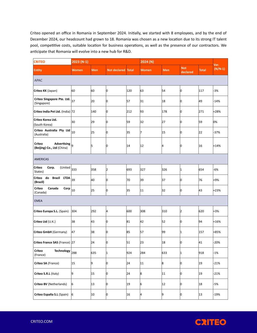 CRITEO.COM Criteo opened an office in Romania in September 2024. Initially, we started with 8 employees, and by the end of December 2024, our headcount had grown to 18. Romania was chosen as a new location due to its strong IT talent pool, competitive costs, suitable location for business operations, as well as the presence of our contractors. We anticipate that Romania will evolve into a new hub for R&D. CRITEO 2023 (N-1) 2024 (N) Var. (N/N-1) Entity Women Men Not declared Total Women Men Not declared Total APAC Criteo KK (Japan) 60 60 0 120 63 54 0 117 -3% Criteo Singapore Pte. Ltd. (Singapore) 37 20 0 57 31 18 0 49 -14% Criteo India Pvt Ltd. (India) 72 140 0 212 93 178 0 271 +28% Criteo Korea Ltd. (South Korea) 30 29 0 59 32 27 0 59 0% Criteo Australia Pty Ltd (Australia) 10 25 0 35 7 15 0 22 -37% Criteo Advertising (Beijing) Co., Ltd (China) 9 5 0 14 12 4 0 16 +14% AMERICAS Criteo Corp. (United States) 333 358 2 693 327 326 1 654 -6% Criteo do Brazil LTDA (Brazil) 39 40 0 70 39 37 0 76 +9% Criteo Canada Corp (Canada) 10 25 0 35 11 32 0 43 +23% EMEA Criteo Europa S.L. (Spain) 304 292 4 600 308 310 2 620 +3% Criteo Ltd (U.K.) 38 43 0 81 42 52 0 94 +16% Criteo GmbH (Germany) 47 38 0 85 57 99 1 157 +85% Criteo France SAS (France) 27 24 0 51 23 18 0 41 -20% Criteo Technology (France) 288 635 1 924 284 633 1 918 -1% Criteo SA (France) 15 9 0 24 11 8 0 19 -21% Criteo S.R.L (Italy) 9 15 0 24 8 11 0 19 -21% Criteo BV (Netherlands) 6 13 0 19 6 12 0 18 -5% Criteo España S.L (Spain) 6 10 0 16 4 9 0 13 -19%