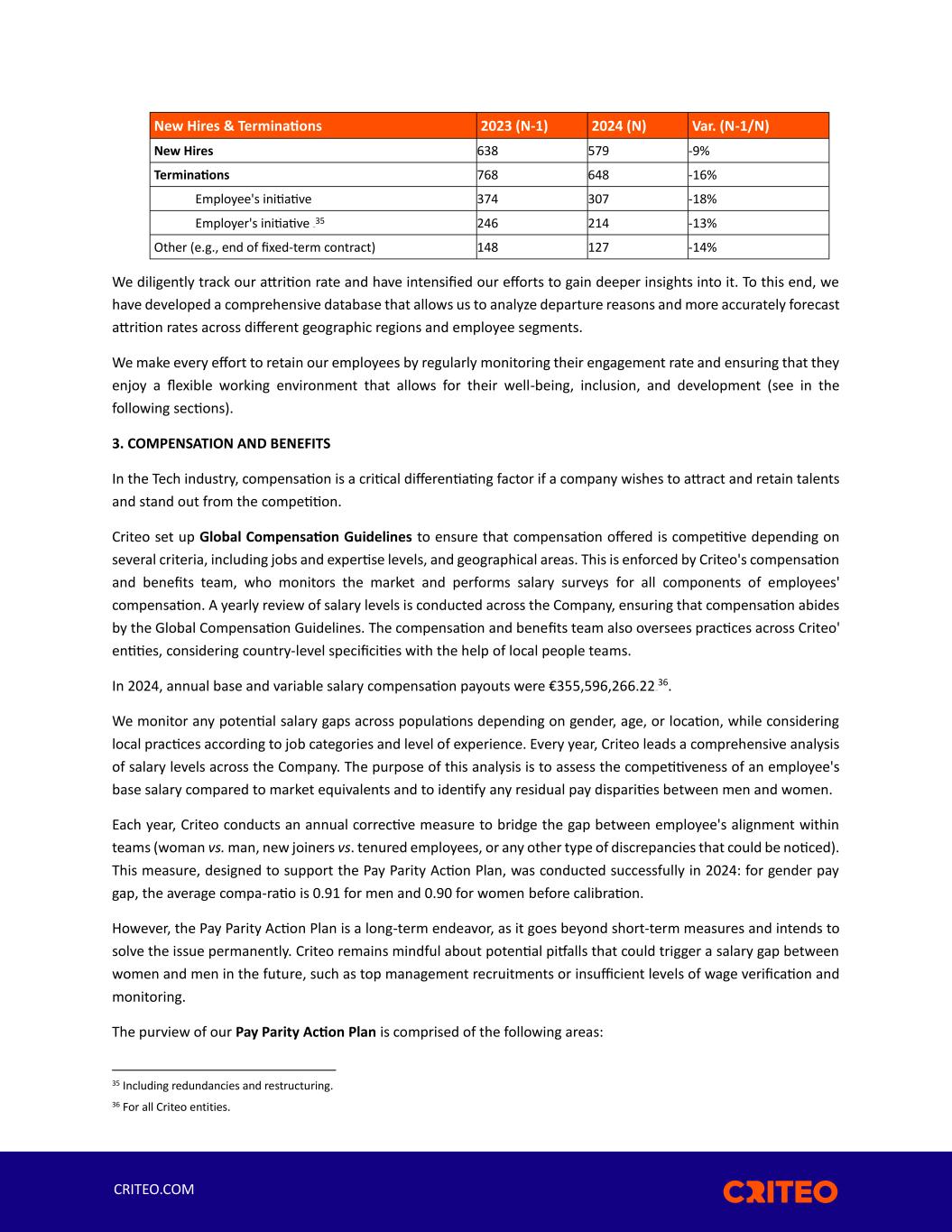 CRITEO.COM New Hires & Terminations 2023 (N-1) 2024 (N) Var. (N-1/N) New Hires 638 579 -9% Terminations 768 648 -16% Employee's initiative 374 307 -18% Employer's initiative 3 4F 35 246 214 -13% Other (e.g., end of fixed-term contract) 148 127 -14% We diligently track our attrition rate and have intensified our efforts to gain deeper insights into it. To this end, we have developed a comprehensive database that allows us to analyze departure reasons and more accurately forecast attrition rates across different geographic regions and employee segments. We make every effort to retain our employees by regularly monitoring their engagement rate and ensuring that they enjoy a flexible working environment that allows for their well-being, inclusion, and development (see in the following sections). 3. COMPENSATION AND BENEFITS In the Tech industry, compensation is a critical differentiating factor if a company wishes to attract and retain talents and stand out from the competition. Criteo set up Global Compensation Guidelines to ensure that compensation offered is competitive depending on several criteria, including jobs and expertise levels, and geographical areas. This is enforced by Criteo's compensation and benefits team, who monitors the market and performs salary surveys for all components of employees' compensation. A yearly review of salary levels is conducted across the Company, ensuring that compensation abides by the Global Compensation Guidelines. The compensation and benefits team also oversees practices across Criteo' entities, considering country-level specificities with the help of local people teams. In 2024, annual base and variable salary compensation payouts were €355,596,266.22 3 5F 36. We monitor any potential salary gaps across populations depending on gender, age, or location, while considering local practices according to job categories and level of experience. Every year, Criteo leads a comprehensive analysis of salary levels across the Company. The purpose of this analysis is to assess the competitiveness of an employee's base salary compared to market equivalents and to identify any residual pay disparities between men and women. Each year, Criteo conducts an annual corrective measure to bridge the gap between employee's alignment within teams (woman vs. man, new joiners vs. tenured employees, or any other type of discrepancies that could be noticed). This measure, designed to support the Pay Parity Action Plan, was conducted successfully in 2024: for gender pay gap, the average compa-ratio is 0.91 for men and 0.90 for women before calibration. However, the Pay Parity Action Plan is a long-term endeavor, as it goes beyond short-term measures and intends to solve the issue permanently. Criteo remains mindful about potential pitfalls that could trigger a salary gap between women and men in the future, such as top management recruitments or insufficient levels of wage verification and monitoring. The purview of our Pay Parity Action Plan is comprised of the following areas: 35 Including redundancies and restructuring. 36 For all Criteo entities.