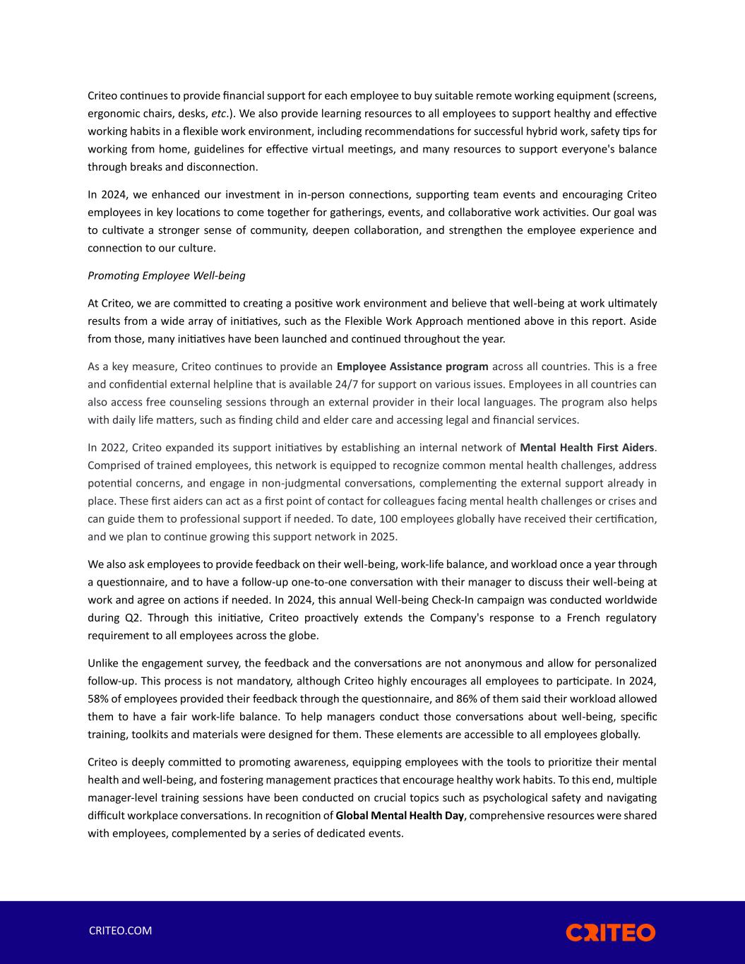 CRITEO.COM Criteo continues to provide financial support for each employee to buy suitable remote working equipment (screens, ergonomic chairs, desks, etc.). We also provide learning resources to all employees to support healthy and effective working habits in a flexible work environment, including recommendations for successful hybrid work, safety tips for working from home, guidelines for effective virtual meetings, and many resources to support everyone's balance through breaks and disconnection. In 2024, we enhanced our investment in in-person connections, supporting team events and encouraging Criteo employees in key locations to come together for gatherings, events, and collaborative work activities. Our goal was to cultivate a stronger sense of community, deepen collaboration, and strengthen the employee experience and connection to our culture. Promoting Employee Well-being At Criteo, we are committed to creating a positive work environment and believe that well-being at work ultimately results from a wide array of initiatives, such as the Flexible Work Approach mentioned above in this report. Aside from those, many initiatives have been launched and continued throughout the year. As a key measure, Criteo continues to provide an Employee Assistance program across all countries. This is a free and confidential external helpline that is available 24/7 for support on various issues. Employees in all countries can also access free counseling sessions through an external provider in their local languages. The program also helps with daily life matters, such as finding child and elder care and accessing legal and financial services. In 2022, Criteo expanded its support initiatives by establishing an internal network of Mental Health First Aiders. Comprised of trained employees, this network is equipped to recognize common mental health challenges, address potential concerns, and engage in non-judgmental conversations, complementing the external support already in place. These first aiders can act as a first point of contact for colleagues facing mental health challenges or crises and can guide them to professional support if needed. To date, 100 employees globally have received their certification, and we plan to continue growing this support network in 2025. We also ask employees to provide feedback on their well-being, work-life balance, and workload once a year through a questionnaire, and to have a follow-up one-to-one conversation with their manager to discuss their well-being at work and agree on actions if needed. In 2024, this annual Well-being Check-In campaign was conducted worldwide during Q2. Through this initiative, Criteo proactively extends the Company's response to a French regulatory requirement to all employees across the globe. Unlike the engagement survey, the feedback and the conversations are not anonymous and allow for personalized follow-up. This process is not mandatory, although Criteo highly encourages all employees to participate. In 2024, 58% of employees provided their feedback through the questionnaire, and 86% of them said their workload allowed them to have a fair work-life balance. To help managers conduct those conversations about well-being, specific training, toolkits and materials were designed for them. These elements are accessible to all employees globally. Criteo is deeply committed to promoting awareness, equipping employees with the tools to prioritize their mental health and well-being, and fostering management practices that encourage healthy work habits. To this end, multiple manager-level training sessions have been conducted on crucial topics such as psychological safety and navigating difficult workplace conversations. In recognition of Global Mental Health Day, comprehensive resources were shared with employees, complemented by a series of dedicated events.