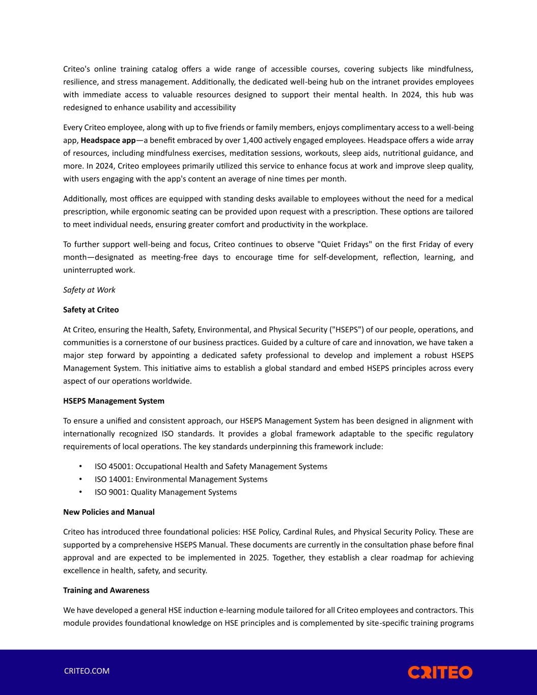 CRITEO.COM Criteo's online training catalog offers a wide range of accessible courses, covering subjects like mindfulness, resilience, and stress management. Additionally, the dedicated well-being hub on the intranet provides employees with immediate access to valuable resources designed to support their mental health. In 2024, this hub was redesigned to enhance usability and accessibility Every Criteo employee, along with up to five friends or family members, enjoys complimentary access to a well-being app, Headspace app—a benefit embraced by over 1,400 actively engaged employees. Headspace offers a wide array of resources, including mindfulness exercises, meditation sessions, workouts, sleep aids, nutritional guidance, and more. In 2024, Criteo employees primarily utilized this service to enhance focus at work and improve sleep quality, with users engaging with the app's content an average of nine times per month. Additionally, most offices are equipped with standing desks available to employees without the need for a medical prescription, while ergonomic seating can be provided upon request with a prescription. These options are tailored to meet individual needs, ensuring greater comfort and productivity in the workplace. To further support well-being and focus, Criteo continues to observe "Quiet Fridays" on the first Friday of every month—designated as meeting-free days to encourage time for self-development, reflection, learning, and uninterrupted work. Safety at Work Safety at Criteo At Criteo, ensuring the Health, Safety, Environmental, and Physical Security ("HSEPS") of our people, operations, and communities is a cornerstone of our business practices. Guided by a culture of care and innovation, we have taken a major step forward by appointing a dedicated safety professional to develop and implement a robust HSEPS Management System. This initiative aims to establish a global standard and embed HSEPS principles across every aspect of our operations worldwide. HSEPS Management System To ensure a unified and consistent approach, our HSEPS Management System has been designed in alignment with internationally recognized ISO standards. It provides a global framework adaptable to the specific regulatory requirements of local operations. The key standards underpinning this framework include: • ISO 45001: Occupational Health and Safety Management Systems • ISO 14001: Environmental Management Systems • ISO 9001: Quality Management Systems New Policies and Manual Criteo has introduced three foundational policies: HSE Policy, Cardinal Rules, and Physical Security Policy. These are supported by a comprehensive HSEPS Manual. These documents are currently in the consultation phase before final approval and are expected to be implemented in 2025. Together, they establish a clear roadmap for achieving excellence in health, safety, and security. Training and Awareness We have developed a general HSE induction e-learning module tailored for all Criteo employees and contractors. This module provides foundational knowledge on HSE principles and is complemented by site-specific training programs