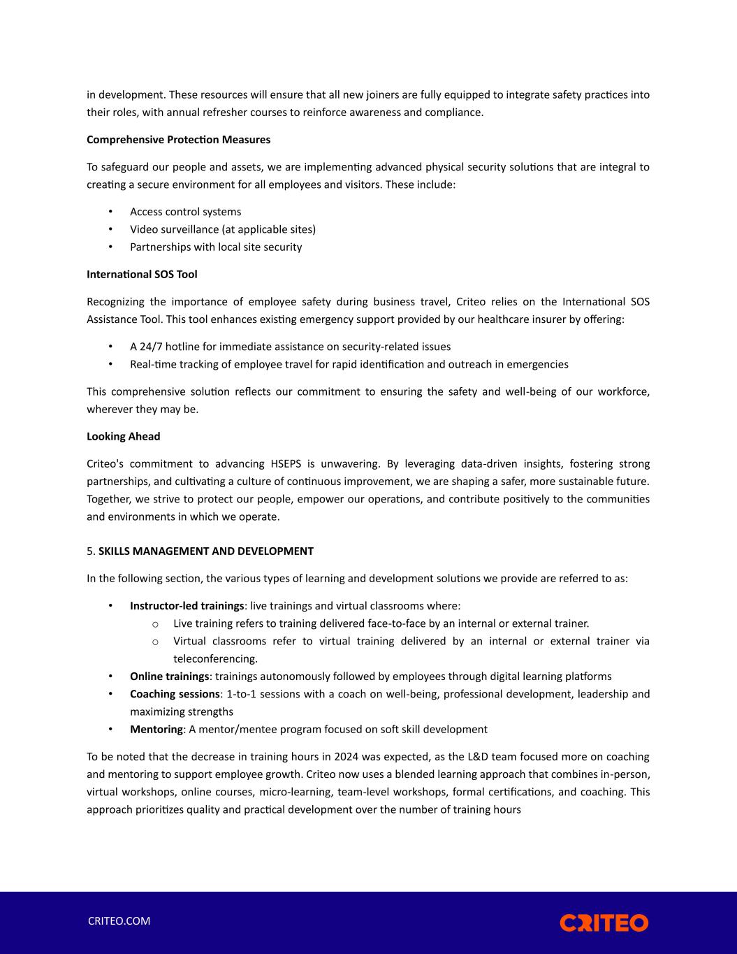 CRITEO.COM in development. These resources will ensure that all new joiners are fully equipped to integrate safety practices into their roles, with annual refresher courses to reinforce awareness and compliance. Comprehensive Protection Measures To safeguard our people and assets, we are implementing advanced physical security solutions that are integral to creating a secure environment for all employees and visitors. These include: • Access control systems • Video surveillance (at applicable sites) • Partnerships with local site security International SOS Tool Recognizing the importance of employee safety during business travel, Criteo relies on the International SOS Assistance Tool. This tool enhances existing emergency support provided by our healthcare insurer by offering: • A 24/7 hotline for immediate assistance on security-related issues • Real-time tracking of employee travel for rapid identification and outreach in emergencies This comprehensive solution reflects our commitment to ensuring the safety and well-being of our workforce, wherever they may be. Looking Ahead Criteo's commitment to advancing HSEPS is unwavering. By leveraging data-driven insights, fostering strong partnerships, and cultivating a culture of continuous improvement, we are shaping a safer, more sustainable future. Together, we strive to protect our people, empower our operations, and contribute positively to the communities and environments in which we operate. 5. SKILLS MANAGEMENT AND DEVELOPMENT In the following section, the various types of learning and development solutions we provide are referred to as: • Instructor-led trainings: live trainings and virtual classrooms where: o Live training refers to training delivered face-to-face by an internal or external trainer. o Virtual classrooms refer to virtual training delivered by an internal or external trainer via teleconferencing. • Online trainings: trainings autonomously followed by employees through digital learning platforms • Coaching sessions: 1-to-1 sessions with a coach on well-being, professional development, leadership and maximizing strengths • Mentoring: A mentor/mentee program focused on soft skill development To be noted that the decrease in training hours in 2024 was expected, as the L&D team focused more on coaching and mentoring to support employee growth. Criteo now uses a blended learning approach that combines in-person, virtual workshops, online courses, micro-learning, team-level workshops, formal certifications, and coaching. This approach prioritizes quality and practical development over the number of training hours