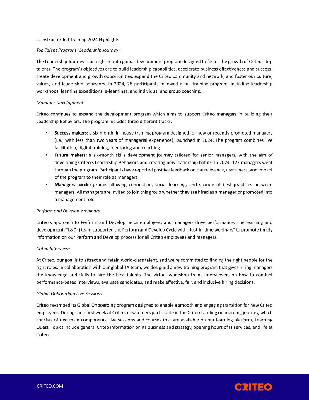 CRITEO.COM a. Instructor-led Training 2024 Highlights Top Talent Program "Leadership Journey" The Leadership Journey is an eight-month global development program designed to foster the growth of Criteo's top talents. The program's objectives are to build leadership capabilities, accelerate business effectiveness and success, create development and growth opportunities, expand the Criteo community and network, and foster our culture, values, and leadership behaviors. In 2024, 28 participants followed a full training program, including leadership workshops, learning expeditions, e-learnings, and individual and group coaching. Manager Development Criteo continues to expand the development program which aims to support Criteo managers in building their Leadership Behaviors. The program includes three different tracks: • Success makers: a six-month, in-house training program designed for new or recently promoted managers (i.e., with less than two years of managerial experience), launched in 2024. The program combines live facilitation, digital training, mentoring and coaching. • Future makers: a six-month skills development journey tailored for senior managers, with the aim of developing Criteo's Leadership Behaviors and creating new leadership habits. In 2024, 122 managers went through the program. Participants have reported positive feedback on the relevance, usefulness, and impact of the program to their role as managers. • Managers' circle: groups allowing connection, social learning, and sharing of best practices between managers. All managers are invited to join this group whether they are hired as a manager or promoted into a management role. Perform and Develop Webinars Criteo's approach to Perform and Develop helps employees and managers drive performance. The learning and development ("L&D") team supported the Perform and Develop Cycle with "Just-in-time webinars" to promote timely information on our Perform and Develop process for all Criteo employees and managers. Criteo Interviews At Criteo, our goal is to attract and retain world-class talent, and we're committed to finding the right people for the right roles. In collaboration with our global TA team, we designed a new training program that gives hiring managers the knowledge and skills to hire the best talents. The virtual workshop trains interviewers on how to conduct performance-based interviews, evaluate candidates, and make effective, fair, and inclusive hiring decisions. Global Onboarding Live Sessions Criteo revamped its Global Onboarding program designed to enable a smooth and engaging transition for new Criteo employees. During their first week at Criteo, newcomers participate in the Criteo Landing onboarding journey, which consists of two main components: live sessions and courses that are available on our learning platform, Learning Quest. Topics include general Criteo information on its business and strategy, opening hours of IT services, and life at Criteo.