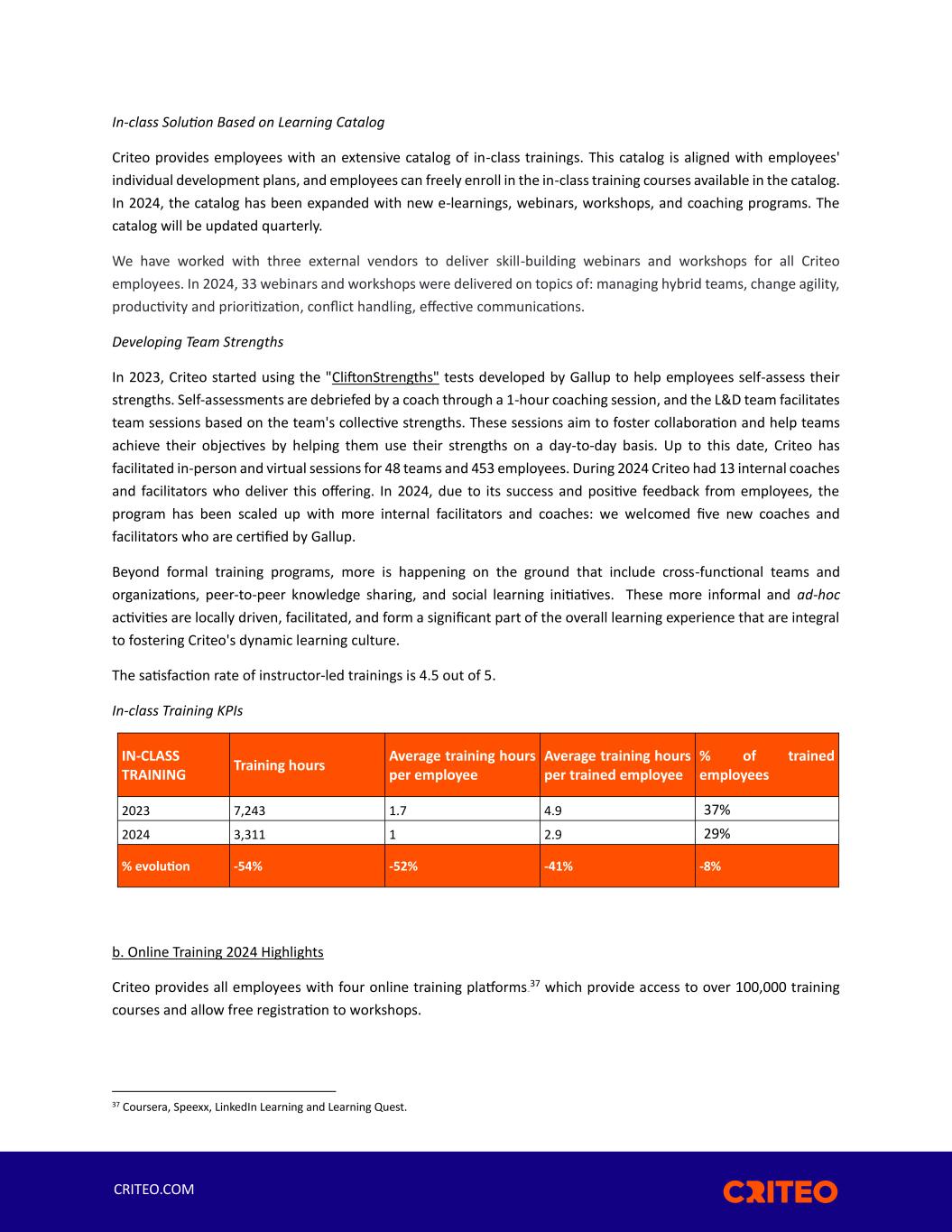CRITEO.COM In-class Solution Based on Learning Catalog Criteo provides employees with an extensive catalog of in-class trainings. This catalog is aligned with employees' individual development plans, and employees can freely enroll in the in-class training courses available in the catalog. In 2024, the catalog has been expanded with new e-learnings, webinars, workshops, and coaching programs. The catalog will be updated quarterly. We have worked with three external vendors to deliver skill-building webinars and workshops for all Criteo employees. In 2024, 33 webinars and workshops were delivered on topics of: managing hybrid teams, change agility, productivity and prioritization, conflict handling, effective communications. Developing Team Strengths In 2023, Criteo started using the "CliftonStrengths" tests developed by Gallup to help employees self-assess their strengths. Self-assessments are debriefed by a coach through a 1-hour coaching session, and the L&D team facilitates team sessions based on the team's collective strengths. These sessions aim to foster collaboration and help teams achieve their objectives by helping them use their strengths on a day-to-day basis. Up to this date, Criteo has facilitated in-person and virtual sessions for 48 teams and 453 employees. During 2024 Criteo had 13 internal coaches and facilitators who deliver this offering. In 2024, due to its success and positive feedback from employees, the program has been scaled up with more internal facilitators and coaches: we welcomed five new coaches and facilitators who are certified by Gallup. Beyond formal training programs, more is happening on the ground that include cross-functional teams and organizations, peer-to-peer knowledge sharing, and social learning initiatives. These more informal and ad-hoc activities are locally driven, facilitated, and form a significant part of the overall learning experience that are integral to fostering Criteo's dynamic learning culture. The satisfaction rate of instructor-led trainings is 4.5 out of 5. In-class Training KPIs IN-CLASS TRAINING Training hours Average training hours per employee Average training hours per trained employee % of trained employees 2023 7,243 1.7 4.9 37% 2024 3,311 1 2.9 29% % evolution -54% -52% -41% -8% b. Online Training 2024 Highlights Criteo provides all employees with four online training platforms 36F 37 which provide access to over 100,000 training courses and allow free registration to workshops. 37 Coursera, Speexx, LinkedIn Learning and Learning Quest.