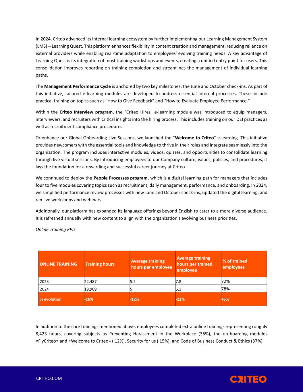 CRITEO.COM In 2024, Criteo advanced its internal learning ecosystem by further implementing our Learning Management System (LMS)—Learning Quest. This platform enhances flexibility in content creation and management, reducing reliance on external providers while enabling real-time adaptation to employees' evolving training needs. A key advantage of Learning Quest is its integration of most training workshops and events, creating a unified entry point for users. This consolidation improves reporting on training completion and streamlines the management of individual learning paths. The Management Performance Cycle is anchored by two key milestones: the June and October check-ins. As part of this initiative, tailored e-learning modules are developed to address essential internal processes. These include practical training on topics such as "How to Give Feedback" and "How to Evaluate Employee Performance." Within the Criteo Interview program, the "Criteo Hires" e-learning module was introduced to equip managers, interviewers, and recruiters with critical insights into the hiring process. This includes training on our DEI practices as well as recruitment compliance procedures. To enhance our Global Onboarding Live Sessions, we launched the "Welcome to Criteo" e-learning. This initiative provides newcomers with the essential tools and knowledge to thrive in their roles and integrate seamlessly into the organization. The program includes interactive modules, videos, quizzes, and opportunities to consolidate learning through live virtual sessions. By introducing employees to our Company culture, values, policies, and procedures, it lays the foundation for a rewarding and successful career journey at Criteo. We continued to deploy the People Processes program, which is a digital learning path for managers that includes four to five modules covering topics such as recruitment, daily management, performance, and onboarding. In 2024, we simplified performance review processes with new June and October check-ins, updated the digital learning, and ran live workshops and webinars. Additionally, our platform has expanded its language offerings beyond English to cater to a more diverse audience. It is refreshed annually with new content to align with the organization's evolving business priorities. Online Training KPIs ONLINE TRAINING Training hours Average training hours per employee Average training hours per trained employee % of trained employees 2023 22,487 5.2 7.8 72% 2024 18,909 5 6.1 78% % evolution -16% -12% -22% +6% In addition to the core trainings mentioned above, employees completed extra online trainings representing roughly 8,423 hours, covering subjects as Preventing Harassment in the Workplace (35%), the on-boarding modules «FlyCriteo» and «Welcome to Criteo» ( 12%), Security for us ( 15%), and Code of Business Conduct & Ethics (37%).