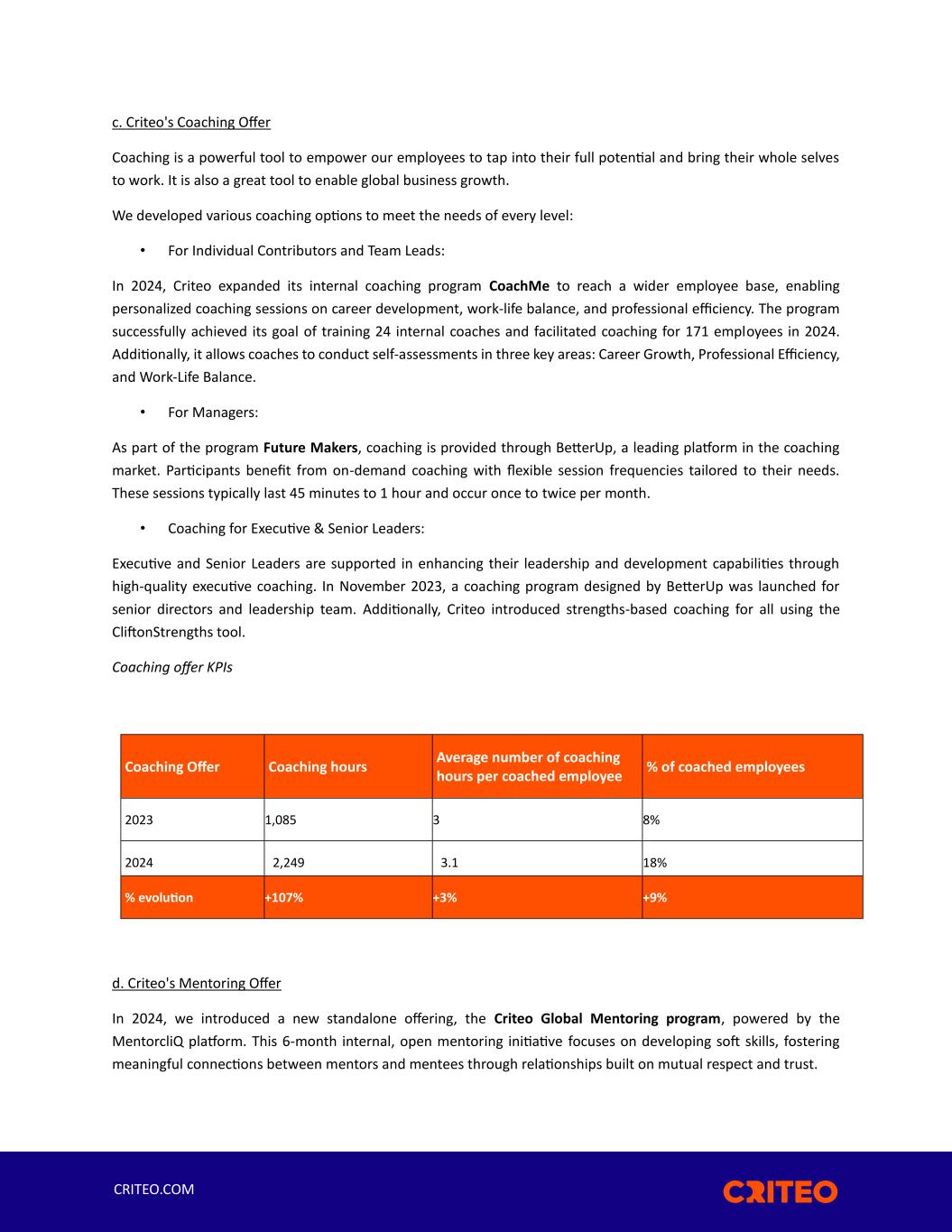 CRITEO.COM c. Criteo's Coaching Offer Coaching is a powerful tool to empower our employees to tap into their full potential and bring their whole selves to work. It is also a great tool to enable global business growth. We developed various coaching options to meet the needs of every level: • For Individual Contributors and Team Leads: In 2024, Criteo expanded its internal coaching program CoachMe to reach a wider employee base, enabling personalized coaching sessions on career development, work-life balance, and professional efficiency. The program successfully achieved its goal of training 24 internal coaches and facilitated coaching for 171 employees in 2024. Additionally, it allows coaches to conduct self-assessments in three key areas: Career Growth, Professional Efficiency, and Work-Life Balance. • For Managers: As part of the program Future Makers, coaching is provided through BetterUp, a leading platform in the coaching market. Participants benefit from on-demand coaching with flexible session frequencies tailored to their needs. These sessions typically last 45 minutes to 1 hour and occur once to twice per month. • Coaching for Executive & Senior Leaders: Executive and Senior Leaders are supported in enhancing their leadership and development capabilities through high-quality executive coaching. In November 2023, a coaching program designed by BetterUp was launched for senior directors and leadership team. Additionally, Criteo introduced strengths-based coaching for all using the CliftonStrengths tool. Coaching offer KPIs Coaching Offer Coaching hours Average number of coaching hours per coached employee % of coached employees 2023 1,085 3 8% 2024 2,249 3.1 18% % evolution +107% +3% +9% d. Criteo's Mentoring Offer In 2024, we introduced a new standalone offering, the Criteo Global Mentoring program, powered by the MentorcliQ platform. This 6-month internal, open mentoring initiative focuses on developing soft skills, fostering meaningful connections between mentors and mentees through relationships built on mutual respect and trust.