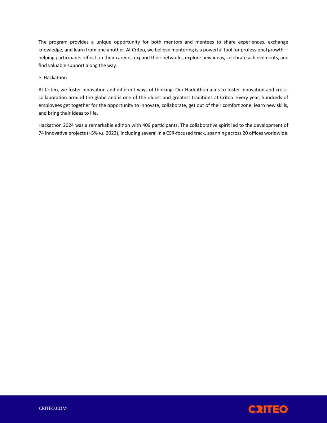 CRITEO.COM The program provides a unique opportunity for both mentors and mentees to share experiences, exchange knowledge, and learn from one another. At Criteo, we believe mentoring is a powerful tool for professional growth— helping participants reflect on their careers, expand their networks, explore new ideas, celebrate achievements, and find valuable support along the way. e. Hackathon At Criteo, we foster innovation and different ways of thinking. Our Hackathon aims to foster innovation and cross- collaboration around the globe and is one of the oldest and greatest traditions at Criteo. Every year, hundreds of employees get together for the opportunity to innovate, collaborate, get out of their comfort zone, learn new skills, and bring their ideas to life. Hackathon 2024 was a remarkable edition with 409 participants. The collaborative spirit led to the development of 74 innovative projects (+5% vs. 2023), including several in a CSR-focused track, spanning across 20 offices worldwide.