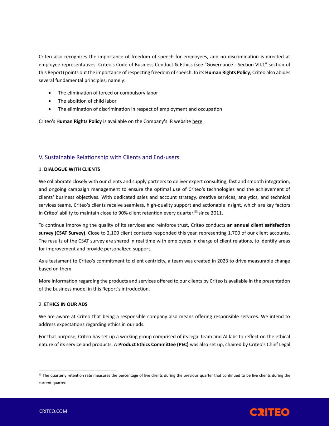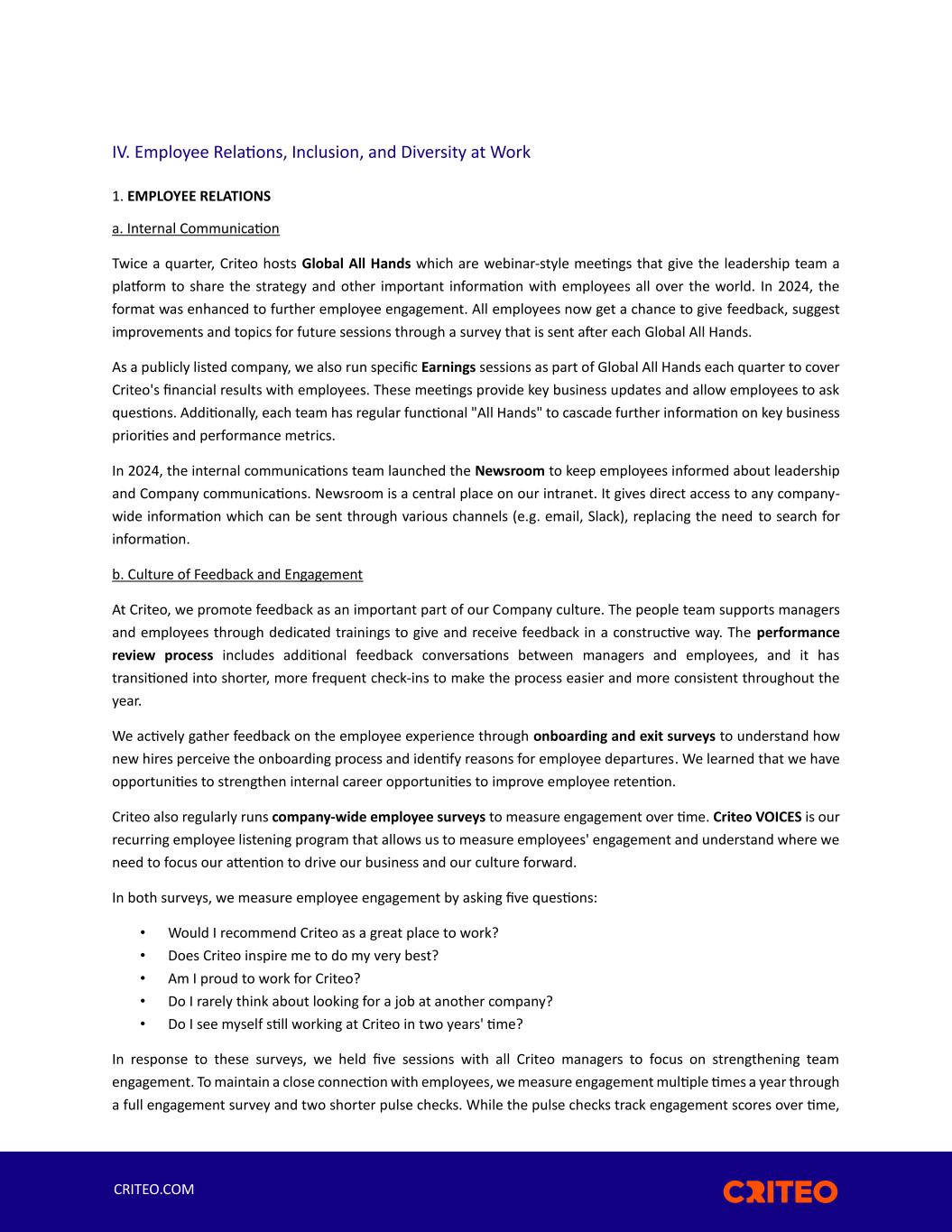 CRITEO.COM IV. Employee Relations, Inclusion, and Diversity at Work 1. EMPLOYEE RELATIONS a. Internal Communication Twice a quarter, Criteo hosts Global All Hands which are webinar-style meetings that give the leadership team a platform to share the strategy and other important information with employees all over the world. In 2024, the format was enhanced to further employee engagement. All employees now get a chance to give feedback, suggest improvements and topics for future sessions through a survey that is sent after each Global All Hands. As a publicly listed company, we also run specific Earnings sessions as part of Global All Hands each quarter to cover Criteo's financial results with employees. These meetings provide key business updates and allow employees to ask questions. Additionally, each team has regular functional "All Hands" to cascade further information on key business priorities and performance metrics. In 2024, the internal communications team launched the Newsroom to keep employees informed about leadership and Company communications. Newsroom is a central place on our intranet. It gives direct access to any company- wide information which can be sent through various channels (e.g. email, Slack), replacing the need to search for information. b. Culture of Feedback and Engagement At Criteo, we promote feedback as an important part of our Company culture. The people team supports managers and employees through dedicated trainings to give and receive feedback in a constructive way. The performance review process includes additional feedback conversations between managers and employees, and it has transitioned into shorter, more frequent check-ins to make the process easier and more consistent throughout the year. We actively gather feedback on the employee experience through onboarding and exit surveys to understand how new hires perceive the onboarding process and identify reasons for employee departures. We learned that we have opportunities to strengthen internal career opportunities to improve employee retention. Criteo also regularly runs company-wide employee surveys to measure engagement over time. Criteo VOICES is our recurring employee listening program that allows us to measure employees' engagement and understand where we need to focus our attention to drive our business and our culture forward. In both surveys, we measure employee engagement by asking five questions: • Would I recommend Criteo as a great place to work? • Does Criteo inspire me to do my very best? • Am I proud to work for Criteo? • Do I rarely think about looking for a job at another company? • Do I see myself still working at Criteo in two years' time? In response to these surveys, we held five sessions with all Criteo managers to focus on strengthening team engagement. To maintain a close connection with employees, we measure engagement multiple times a year through a full engagement survey and two shorter pulse checks. While the pulse checks track engagement scores over time,