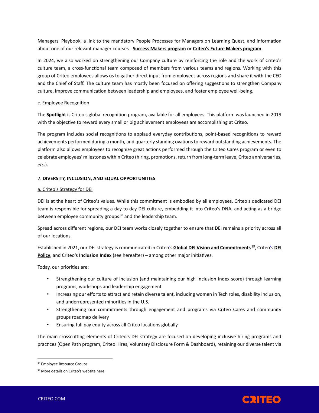 CRITEO.COM Managers' Playbook, a link to the mandatory People Processes for Managers on Learning Quest, and information about one of our relevant manager courses - Success Makers program or Criteo's Future Makers program. In 2024, we also worked on strengthening our Company culture by reinforcing the role and the work of Criteo's culture team, a cross-functional team composed of members from various teams and regions. Working with this group of Criteo employees allows us to gather direct input from employees across regions and share it with the CEO and the Chief of Staff. The culture team has mostly been focused on offering suggestions to strengthen Company culture, improve communication between leadership and employees, and foster employee well-being. c. Employee Recognition The Spotlight is Criteo's global recognition program, available for all employees. This platform was launched in 2019 with the objective to reward every small or big achievement employees are accomplishing at Criteo. The program includes social recognitions to applaud everyday contributions, point-based recognitions to reward achievements performed during a month, and quarterly standing ovations to reward outstanding achievements. The platform also allows employees to recognize great actions performed through the Criteo Cares program or even to celebrate employees' milestones within Criteo (hiring, promotions, return from long-term leave, Criteo anniversaries, etc.). 2. DIVERSITY, INCLUSION, AND EQUAL OPPORTUNITIES a. Criteo's Strategy for DEI DEI is at the heart of Criteo's values. While this commitment is embodied by all employees, Criteo's dedicated DEI team is responsible for spreading a day-to-day DEI culture, embedding it into Criteo's DNA, and acting as a bridge between employee community groups37F 38 and the leadership team. Spread across different regions, our DEI team works closely together to ensure that DEI remains a priority across all of our locations. Established in 2021, our DEI strategy is communicated in Criteo's Global DEI Vision and Commitments 38F 39, Criteo's DEI Policy, and Criteo's Inclusion Index (see hereafter) – among other major initiatives. Today, our priorities are: • Strengthening our culture of inclusion (and maintaining our high Inclusion Index score) through learning programs, workshops and leadership engagement • Increasing our efforts to attract and retain diverse talent, including women in Tech roles, disability inclusion, and underrepresented minorities in the U.S. • Strengthening our commitments through engagement and programs via Criteo Cares and community groups roadmap delivery • Ensuring full pay equity across all Criteo locations globally The main crosscutting elements of Criteo's DEI strategy are focused on developing inclusive hiring programs and practices (Open Path program, Criteo Hires, Voluntary Disclosure Form & Dashboard), retaining our diverse talent via 38 Employee Resource Groups. 39 More details on Criteo's website here.