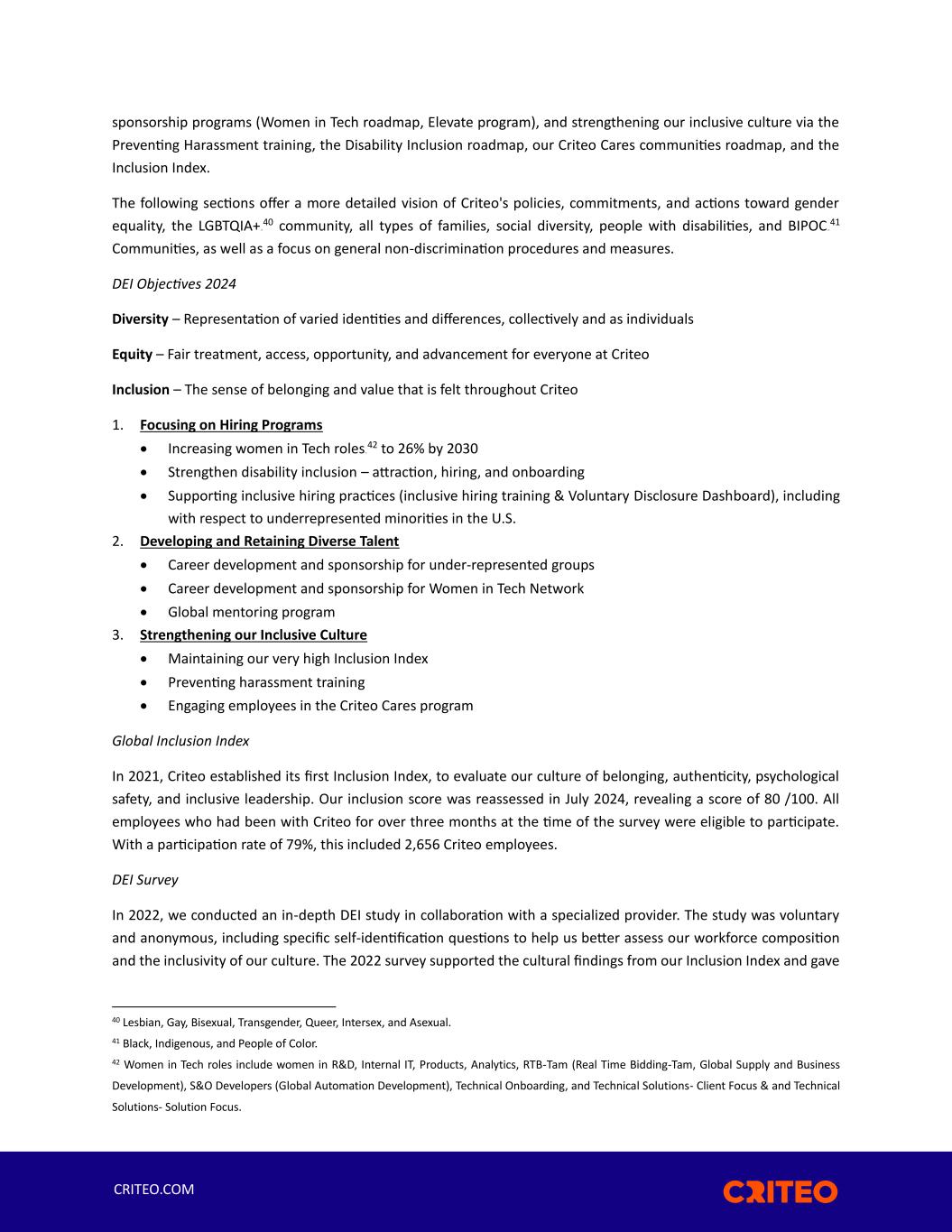 CRITEO.COM sponsorship programs (Women in Tech roadmap, Elevate program), and strengthening our inclusive culture via the Preventing Harassment training, the Disability Inclusion roadmap, our Criteo Cares communities roadmap, and the Inclusion Index. The following sections offer a more detailed vision of Criteo's policies, commitments, and actions toward gender equality, the LGBTQIA+ 39F 40 community, all types of families, social diversity, people with disabilities, and BIPOC 40F 41 Communities, as well as a focus on general non-discrimination procedures and measures. DEI Objectives 2024 Diversity – Representation of varied identities and differences, collectively and as individuals Equity – Fair treatment, access, opportunity, and advancement for everyone at Criteo Inclusion – The sense of belonging and value that is felt throughout Criteo 1. Focusing on Hiring Programs • Increasing women in Tech roles41F 42 to 26% by 2030 • Strengthen disability inclusion – attraction, hiring, and onboarding • Supporting inclusive hiring practices (inclusive hiring training & Voluntary Disclosure Dashboard), including with respect to underrepresented minorities in the U.S. 2. Developing and Retaining Diverse Talent • Career development and sponsorship for under-represented groups • Career development and sponsorship for Women in Tech Network • Global mentoring program 3. Strengthening our Inclusive Culture • Maintaining our very high Inclusion Index • Preventing harassment training • Engaging employees in the Criteo Cares program Global Inclusion Index In 2021, Criteo established its first Inclusion Index, to evaluate our culture of belonging, authenticity, psychological safety, and inclusive leadership. Our inclusion score was reassessed in July 2024, revealing a score of 80 /100. All employees who had been with Criteo for over three months at the time of the survey were eligible to participate. With a participation rate of 79%, this included 2,656 Criteo employees. DEI Survey In 2022, we conducted an in-depth DEI study in collaboration with a specialized provider. The study was voluntary and anonymous, including specific self-identification questions to help us better assess our workforce composition and the inclusivity of our culture. The 2022 survey supported the cultural findings from our Inclusion Index and gave 40 Lesbian, Gay, Bisexual, Transgender, Queer, Intersex, and Asexual. 41 Black, Indigenous, and People of Color. 42 Women in Tech roles include women in R&D, Internal IT, Products, Analytics, RTB-Tam (Real Time Bidding-Tam, Global Supply and Business Development), S&O Developers (Global Automation Development), Technical Onboarding, and Technical Solutions- Client Focus & and Technical Solutions- Solution Focus.