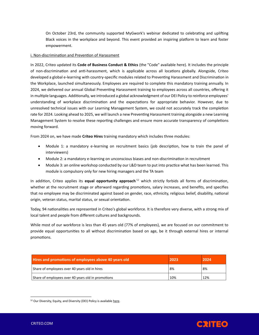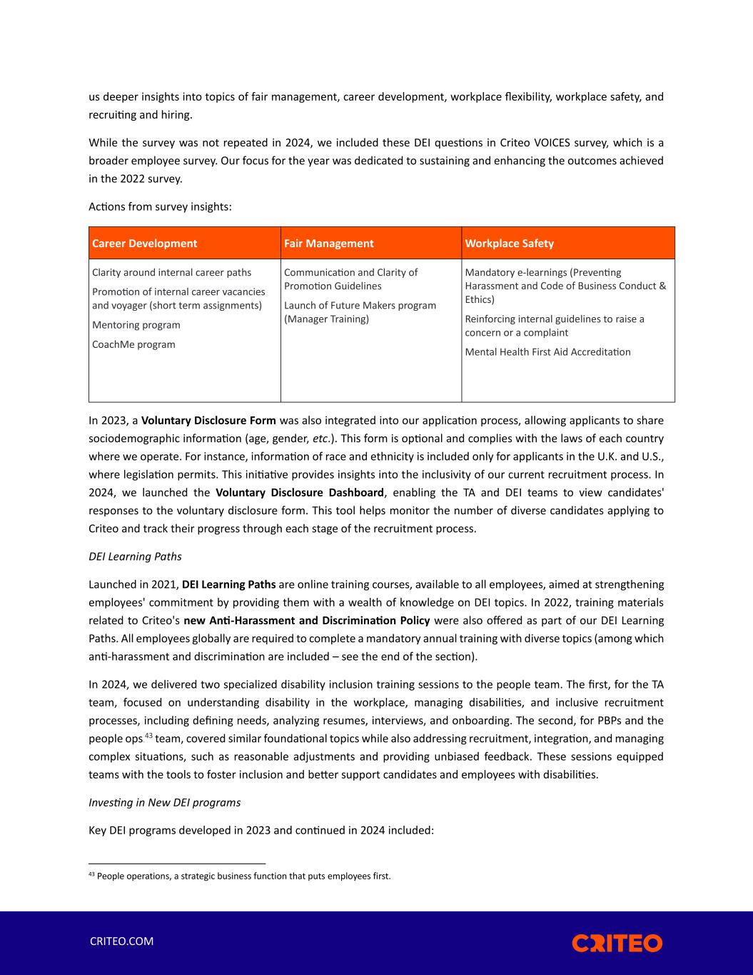 CRITEO.COM us deeper insights into topics of fair management, career development, workplace flexibility, workplace safety, and recruiting and hiring. While the survey was not repeated in 2024, we included these DEI questions in Criteo VOICES survey, which is a broader employee survey. Our focus for the year was dedicated to sustaining and enhancing the outcomes achieved in the 2022 survey. Actions from survey insights: Career Development Fair Management Workplace Safety Clarity around internal career paths Promotion of internal career vacancies and voyager (short term assignments) Mentoring program CoachMe program Communication and Clarity of Promotion Guidelines Launch of Future Makers program (Manager Training) Mandatory e-learnings (Preventing Harassment and Code of Business Conduct & Ethics) Reinforcing internal guidelines to raise a concern or a complaint Mental Health First Aid Accreditation In 2023, a Voluntary Disclosure Form was also integrated into our application process, allowing applicants to share sociodemographic information (age, gender, etc.). This form is optional and complies with the laws of each country where we operate. For instance, information of race and ethnicity is included only for applicants in the U.K. and U.S., where legislation permits. This initiative provides insights into the inclusivity of our current recruitment process. In 2024, we launched the Voluntary Disclosure Dashboard, enabling the TA and DEI teams to view candidates' responses to the voluntary disclosure form. This tool helps monitor the number of diverse candidates applying to Criteo and track their progress through each stage of the recruitment process. DEI Learning Paths Launched in 2021, DEI Learning Paths are online training courses, available to all employees, aimed at strengthening employees' commitment by providing them with a wealth of knowledge on DEI topics. In 2022, training materials related to Criteo's new Anti-Harassment and Discrimination Policy were also offered as part of our DEI Learning Paths. All employees globally are required to complete a mandatory annual training with diverse topics (among which anti-harassment and discrimination are included – see the end of the section). In 2024, we delivered two specialized disability inclusion training sessions to the people team. The first, for the TA team, focused on understanding disability in the workplace, managing disabilities, and inclusive recruitment processes, including defining needs, analyzing resumes, interviews, and onboarding. The second, for PBPs and the people ops42F 43 team, covered similar foundational topics while also addressing recruitment, integration, and managing complex situations, such as reasonable adjustments and providing unbiased feedback. These sessions equipped teams with the tools to foster inclusion and better support candidates and employees with disabilities. Investing in New DEI programs Key DEI programs developed in 2023 and continued in 2024 included: 43 People operations, a strategic business function that puts employees first.