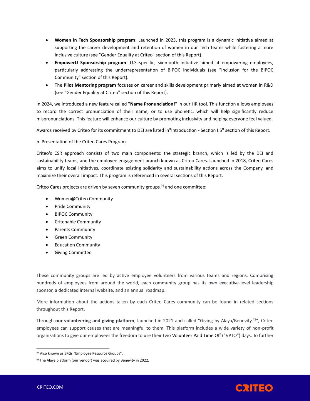 CRITEO.COM • Women in Tech Sponsorship program: Launched in 2023, this program is a dynamic initiative aimed at supporting the career development and retention of women in our Tech teams while fostering a more inclusive culture (see "Gender Equality at Criteo" section of this Report). • EmpowerU Sponsorship program: U.S.-specific, six-month initiative aimed at empowering employees, particularly addressing the underrepresentation of BIPOC individuals (see "Inclusion for the BIPOC Community" section of this Report). • The Pilot Mentoring program focuses on career and skills development primarly aimed at women in R&D (see "Gender Equality at Criteo" section of this Report). In 2024, we introduced a new feature called "Name Pronunciation!" in our HR tool. This function allows employees to record the correct pronunciation of their name, or to use phonetic, which will help significantly reduce mispronunciations. This feature will enhance our culture by promoting inclusivity and helping everyone feel valued. Awards received by Criteo for its commitment to DEI are listed in"Introduction - Section I.5" section of this Report. b. Presentation of the Criteo Cares Program Criteo's CSR approach consists of two main components: the strategic branch, which is led by the DEI and sustainability teams, and the employee engagement branch known as Criteo Cares. Launched in 2018, Criteo Cares aims to unify local initiatives, coordinate existing solidarity and sustainability actions across the Company, and maximize their overall impact. This program is referenced in several sections of this Report. Criteo Cares projects are driven by seven community groups 43F 44 and one committee: • Women@Criteo Community • Pride Community • BIPOC Community • Critenable Community • Parents Community • Green Community • Education Community • Giving Committee These community groups are led by active employee volunteers from various teams and regions. Comprising hundreds of employees from around the world, each community group has its own executive-level leadership sponsor, a dedicated internal website, and an annual roadmap. More information about the actions taken by each Criteo Cares community can be found in related sections throughout this Report. Through our volunteering and giving platform, launched in 2021 and called "Giving by Alaya/Benevity 44F 45", Criteo employees can support causes that are meaningful to them. This platform includes a wide variety of non-profit organizations to give our employees the freedom to use their two Volunteer Paid Time Off ("VPTO") days. To further 44 Also known as ERGs "Employee Resource Groups". 45 The Alaya platform (our vendor) was acquired by Benevity in 2022.