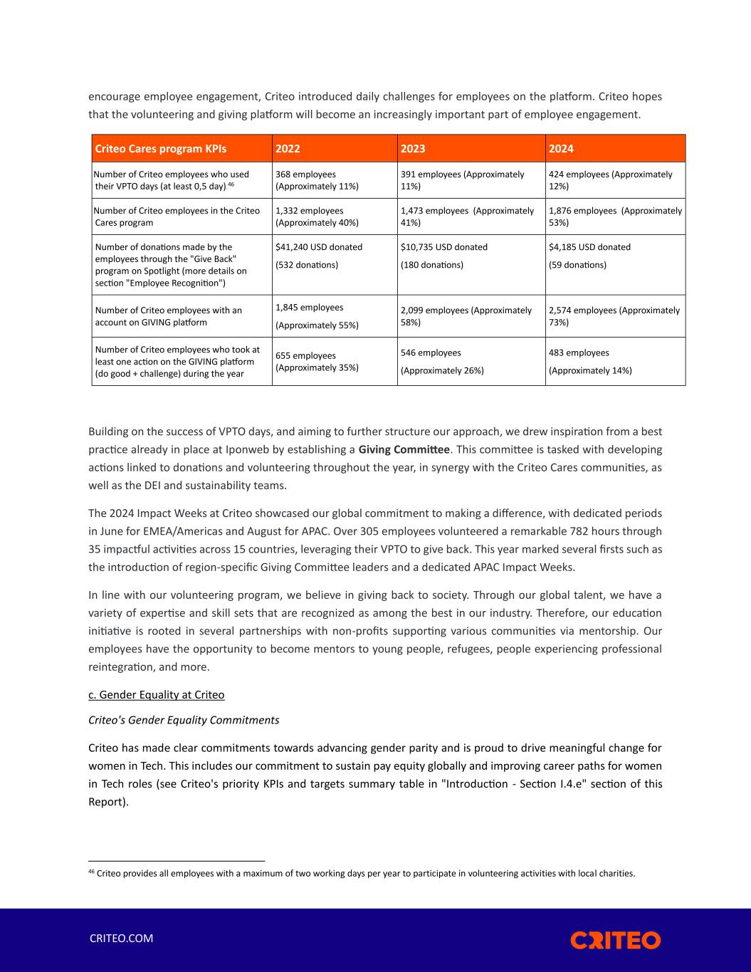 CRITEO.COM encourage employee engagement, Criteo introduced daily challenges for employees on the platform. Criteo hopes that the volunteering and giving platform will become an increasingly important part of employee engagement. Criteo Cares program KPIs 2022 2023 2024 Number of Criteo employees who used their VPTO days (at least 0,5 day)45F 46 368 employees (Approximately 11%) 391 employees (Approximately 11%) 424 employees (Approximately 12%) Number of Criteo employees in the Criteo Cares program 1,332 employees (Approximately 40%) 1,473 employees (Approximately 41%) 1,876 employees (Approximately 53%) Number of donations made by the employees through the "Give Back" program on Spotlight (more details on section "Employee Recognition") $41,240 USD donated (532 donations) $10,735 USD donated (180 donations) $4,185 USD donated (59 donations) Number of Criteo employees with an account on GIVING platform 1,845 employees (Approximately 55%) 2,099 employees (Approximately 58%) 2,574 employees (Approximately 73%) Number of Criteo employees who took at least one action on the GIVING platform (do good + challenge) during the year 655 employees (Approximately 35%) 546 employees (Approximately 26%) 483 employees (Approximately 14%) Building on the success of VPTO days, and aiming to further structure our approach, we drew inspiration from a best practice already in place at Iponweb by establishing a Giving Committee. This committee is tasked with developing actions linked to donations and volunteering throughout the year, in synergy with the Criteo Cares communities, as well as the DEI and sustainability teams. The 2024 Impact Weeks at Criteo showcased our global commitment to making a difference, with dedicated periods in June for EMEA/Americas and August for APAC. Over 305 employees volunteered a remarkable 782 hours through 35 impactful activities across 15 countries, leveraging their VPTO to give back. This year marked several firsts such as the introduction of region-specific Giving Committee leaders and a dedicated APAC Impact Weeks. In line with our volunteering program, we believe in giving back to society. Through our global talent, we have a variety of expertise and skill sets that are recognized as among the best in our industry. Therefore, our education initiative is rooted in several partnerships with non-profits supporting various communities via mentorship. Our employees have the opportunity to become mentors to young people, refugees, people experiencing professional reintegration, and more. c. Gender Equality at Criteo Criteo's Gender Equality Commitments Criteo has made clear commitments towards advancing gender parity and is proud to drive meaningful change for women in Tech. This includes our commitment to sustain pay equity globally and improving career paths for women in Tech roles (see Criteo's priority KPIs and targets summary table in "Introduction - Section I.4.e" section of this Report). 46 Criteo provides all employees with a maximum of two working days per year to participate in volunteering activities with local charities.