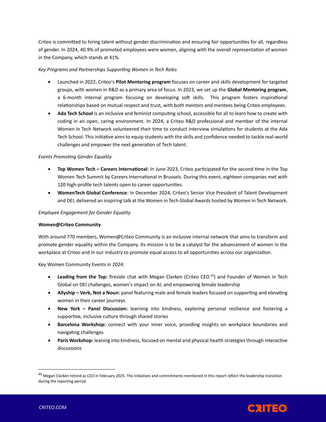 CRITEO.COM Criteo is committed to hiring talent without gender discrimination and ensuring fair opportunities for all, regardless of gender. In 2024, 40.9% of promoted employees were women, aligning with the overall representation of women in the Company, which stands at 41%. Key Programs and Partnerships Supporting Women in Tech Roles • Launched in 2022, Criteo's Pilot Mentoring program focuses on career and skills development for targeted groups, with women in R&D as a primary area of focus. In 2023, we set up the Global Mentoring program, a 6-month internal program focusing on developing soft skills. This program fosters inspirational relationships based on mutual respect and trust, with both mentors and mentees being Criteo employees. • Ada Tech School is an inclusive and feminist computing school, accessible for all to learn how to create with coding in an open, caring environment. In 2024, a Criteo R&D professional and member of the internal Women in Tech Network volunteered their time to conduct interview simulations for students at the Ada Tech School. This initiative aims to equip students with the skills and confidence needed to tackle real-world challenges and empower the next generation of Tech talent. Events Promoting Gender Equality • Top Women Tech – Careers International: In June 2023, Criteo participated for the second time in the Top Women Tech Summit by Careers International in Brussels. During this event, eighteen companies met with 120 high-profile tech talents open to career opportunities. • WomenTech Global Conference: In December 2024, Criteo's Senior Vice President of Talent Development and DEI, delivered an inspiring talk at the Women in Tech Global Awards hosted by Women in Tech Network. Employee Engagement for Gender Equality Women@Criteo Community With around 770 members, Women@Criteo Community is an inclusive internal network that aims to transform and promote gender equality within the Company. Its mission is to be a catalyst for the advancement of women in the workplace at Criteo and in our industry to promote equal access to all opportunities across our organization. Key Women Community Events in 2024: • Leading from the Top: fireside chat with Megan Clarken (Criteo CEO 48F 49) and Founder of Women in Tech Global on DEI challenges, women's impact on AI, and empowering female leadership • Allyship – Verb, Not a Noun: panel featuring male and female leaders focused on supporting and elevating women in their career journeys • New York – Panel Discussion: learning into kindness, exploring personal resilience and fostering a supportive, inclusive culture through shared stories • Barcelona Workshop: connect with your inner voice, providing insights on workplace boundaries and navigating challenges • Paris Workshop: leaning into kindness, focused on mental and physical health strategies through interactive discussions 49 Megan Clarken retired as CEO in February 2025. The initiatives and commitments mentioned in this report reflect the leadership transition during the reporting period.