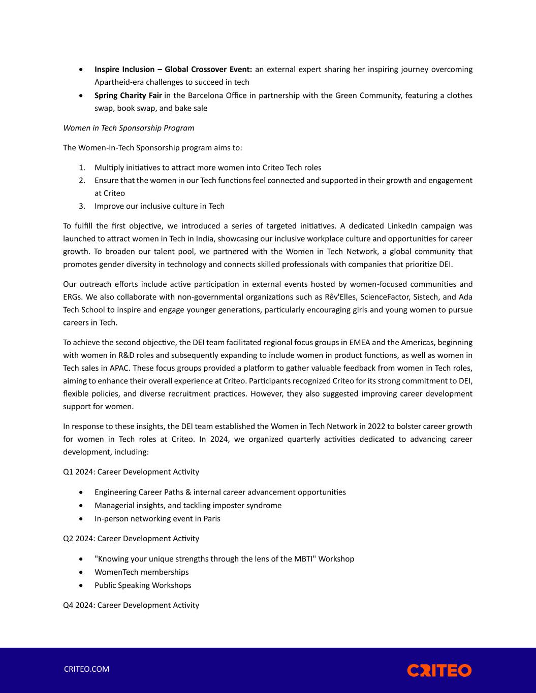 CRITEO.COM • Inspire Inclusion – Global Crossover Event: an external expert sharing her inspiring journey overcoming Apartheid-era challenges to succeed in tech • Spring Charity Fair in the Barcelona Office in partnership with the Green Community, featuring a clothes swap, book swap, and bake sale Women in Tech Sponsorship Program The Women-in-Tech Sponsorship program aims to: 1. Multiply initiatives to attract more women into Criteo Tech roles 2. Ensure that the women in our Tech functions feel connected and supported in their growth and engagement at Criteo 3. Improve our inclusive culture in Tech To fulfill the first objective, we introduced a series of targeted initiatives. A dedicated LinkedIn campaign was launched to attract women in Tech in India, showcasing our inclusive workplace culture and opportunities for career growth. To broaden our talent pool, we partnered with the Women in Tech Network, a global community that promotes gender diversity in technology and connects skilled professionals with companies that prioritize DEI. Our outreach efforts include active participation in external events hosted by women-focused communities and ERGs. We also collaborate with non-governmental organizations such as Rêv'Elles, ScienceFactor, Sistech, and Ada Tech School to inspire and engage younger generations, particularly encouraging girls and young women to pursue careers in Tech. To achieve the second objective, the DEI team facilitated regional focus groups in EMEA and the Americas, beginning with women in R&D roles and subsequently expanding to include women in product functions, as well as women in Tech sales in APAC. These focus groups provided a platform to gather valuable feedback from women in Tech roles, aiming to enhance their overall experience at Criteo. Participants recognized Criteo for its strong commitment to DEI, flexible policies, and diverse recruitment practices. However, they also suggested improving career development support for women. In response to these insights, the DEI team established the Women in Tech Network in 2022 to bolster career growth for women in Tech roles at Criteo. In 2024, we organized quarterly activities dedicated to advancing career development, including: Q1 2024: Career Development Activity • Engineering Career Paths & internal career advancement opportunities • Managerial insights, and tackling imposter syndrome • In-person networking event in Paris Q2 2024: Career Development Activity • "Knowing your unique strengths through the lens of the MBTI" Workshop • WomenTech memberships • Public Speaking Workshops Q4 2024: Career Development Activity