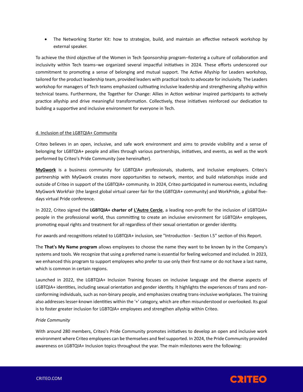 CRITEO.COM • The Networking Starter Kit: how to strategize, build, and maintain an effective network workshop by external speaker. To achieve the third objective of the Women in Tech Sponsorship program–fostering a culture of collaboration and inclusivity within Tech teams–we organized several impactful initiatives in 2024. These efforts underscored our commitment to promoting a sense of belonging and mutual support. The Active Allyship for Leaders workshop, tailored for the product leadership team, provided leaders with practical tools to advocate for inclusivity. The Leaders workshop for managers of Tech teams emphasized cultivating inclusive leadership and strengthening allyship within technical teams. Furthermore, the Together for Change: Allies in Action webinar inspired participants to actively practice allyship and drive meaningful transformation. Collectively, these initiatives reinforced our dedication to building a supportive and inclusive environment for everyone in Tech. d. Inclusion of the LGBTQIA+ Community Criteo believes in an open, inclusive, and safe work environment and aims to provide visibility and a sense of belonging for LGBTQIA+ people and allies through various partnerships, initiatives, and events, as well as the work performed by Criteo's Pride Community (see hereinafter). MyGwork is a business community for LGBTQIA+ professionals, students, and inclusive employers. Criteo's partnership with MyGwork creates more opportunities to network, mentor, and build relationships inside and outside of Criteo in support of the LGBTQIA+ community. In 2024, Criteo participated in numerous events, including MyGwork WorkFair (the largest global virtual career fair for the LGBTQIA+ community) and WorkPride, a global five- days virtual Pride conference. In 2022, Criteo signed the LGBTQIA+ charter of L'Autre Cercle, a leading non-profit for the inclusion of LGBTQIA+ people in the professional world, thus committing to create an inclusive environment for LGBTQIA+ employees, promoting equal rights and treatment for all regardless of their sexual orientation or gender identity. For awards and recognitions related to LGBTQIA+ inclusion, see "Introduction - Section I.5" section of this Report. The That's My Name program allows employees to choose the name they want to be known by in the Company's systems and tools. We recognize that using a preferred name is essential for feeling welcomed and included. In 2023, we enhanced this program to support employees who prefer to use only their first name or do not have a last name, which is common in certain regions. Launched in 2022, the LGBTQIA+ Inclusion Training focuses on inclusive language and the diverse aspects of LGBTQIA+ identities, including sexual orientation and gender identity. It highlights the experiences of trans and non- conforming individuals, such as non-binary people, and emphasizes creating trans-inclusive workplaces. The training also addresses lesser-known identities within the '+' category, which are often misunderstood or overlooked. Its goal is to foster greater inclusion for LGBTQIA+ employees and strengthen allyship within Criteo. Pride Community With around 280 members, Criteo's Pride Community promotes initiatives to develop an open and inclusive work environment where Criteo employees can be themselves and feel supported. In 2024, the Pride Community provided awareness on LGBTQIA+ Inclusion topics throughout the year. The main milestones were the following: