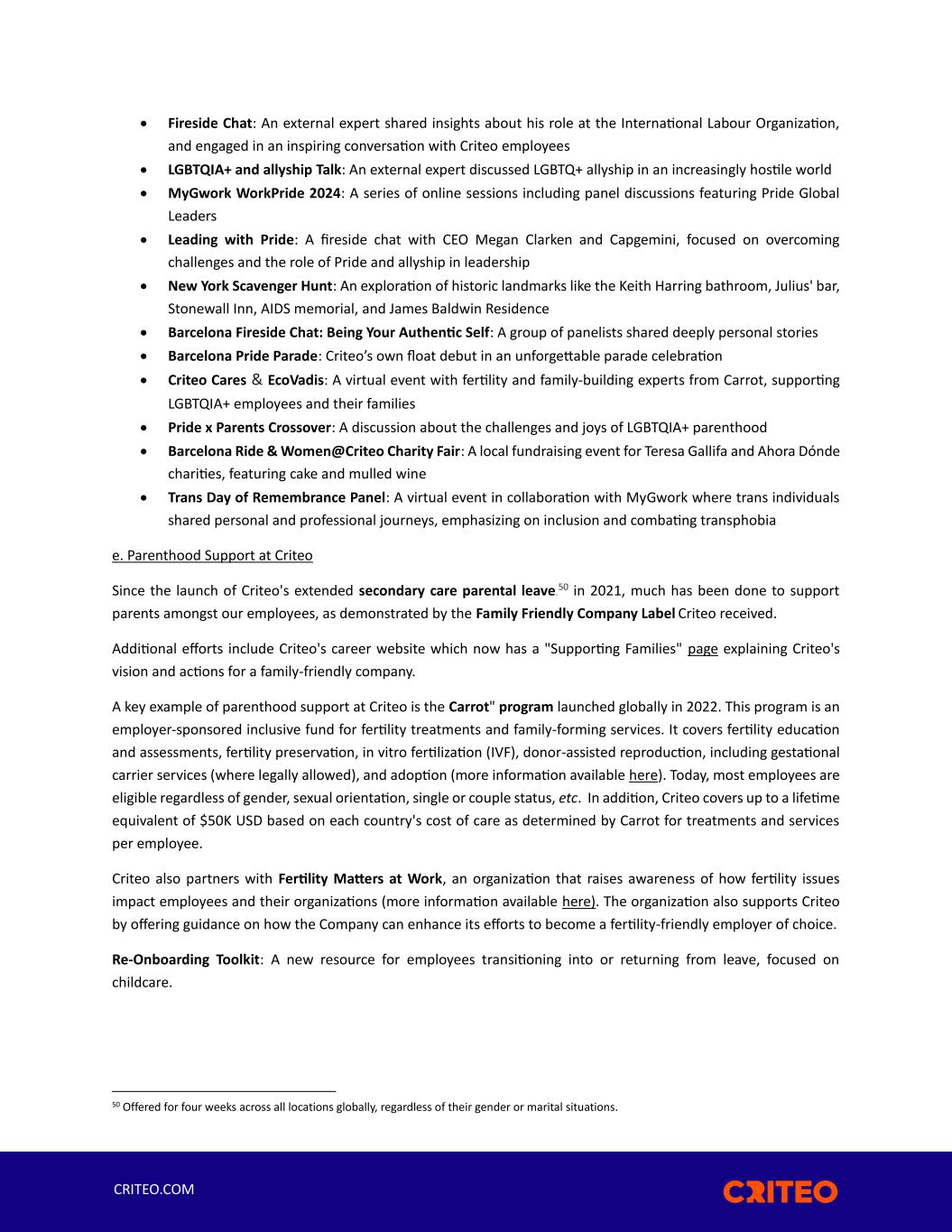 CRITEO.COM • Fireside Chat: An external expert shared insights about his role at the International Labour Organization, and engaged in an inspiring conversation with Criteo employees • LGBTQIA+ and allyship Talk: An external expert discussed LGBTQ+ allyship in an increasingly hostile world • MyGwork WorkPride 2024: A series of online sessions including panel discussions featuring Pride Global Leaders • Leading with Pride: A fireside chat with CEO Megan Clarken and Capgemini, focused on overcoming challenges and the role of Pride and allyship in leadership • New York Scavenger Hunt: An exploration of historic landmarks like the Keith Harring bathroom, Julius' bar, Stonewall Inn, AIDS memorial, and James Baldwin Residence • Barcelona Fireside Chat: Being Your Authentic Self: A group of panelists shared deeply personal stories • Barcelona Pride Parade: Criteo’s own float debut in an unforgettable parade celebration • Criteo Cares & EcoVadis: A virtual event with fertility and family-building experts from Carrot, supporting LGBTQIA+ employees and their families • Pride x Parents Crossover: A discussion about the challenges and joys of LGBTQIA+ parenthood • Barcelona Ride & Women@Criteo Charity Fair: A local fundraising event for Teresa Gallifa and Ahora Dónde charities, featuring cake and mulled wine • Trans Day of Remembrance Panel: A virtual event in collaboration with MyGwork where trans individuals shared personal and professional journeys, emphasizing on inclusion and combating transphobia e. Parenthood Support at Criteo Since the launch of Criteo's extended secondary care parental leave 49F 50 in 2021, much has been done to support parents amongst our employees, as demonstrated by the Family Friendly Company Label Criteo received. Additional efforts include Criteo's career website which now has a "Supporting Families" page explaining Criteo's vision and actions for a family-friendly company. A key example of parenthood support at Criteo is the Carrot" program launched globally in 2022. This program is an employer-sponsored inclusive fund for fertility treatments and family-forming services. It covers fertility education and assessments, fertility preservation, in vitro fertilization (IVF), donor-assisted reproduction, including gestational carrier services (where legally allowed), and adoption (more information available here). Today, most employees are eligible regardless of gender, sexual orientation, single or couple status, etc. In addition, Criteo covers up to a lifetime equivalent of $50K USD based on each country's cost of care as determined by Carrot for treatments and services per employee. Criteo also partners with Fertility Matters at Work, an organization that raises awareness of how fertility issues impact employees and their organizations (more information available here). The organization also supports Criteo by offering guidance on how the Company can enhance its efforts to become a fertility-friendly employer of choice. Re-Onboarding Toolkit: A new resource for employees transitioning into or returning from leave, focused on childcare. 50 Offered for four weeks across all locations globally, regardless of their gender or marital situations.