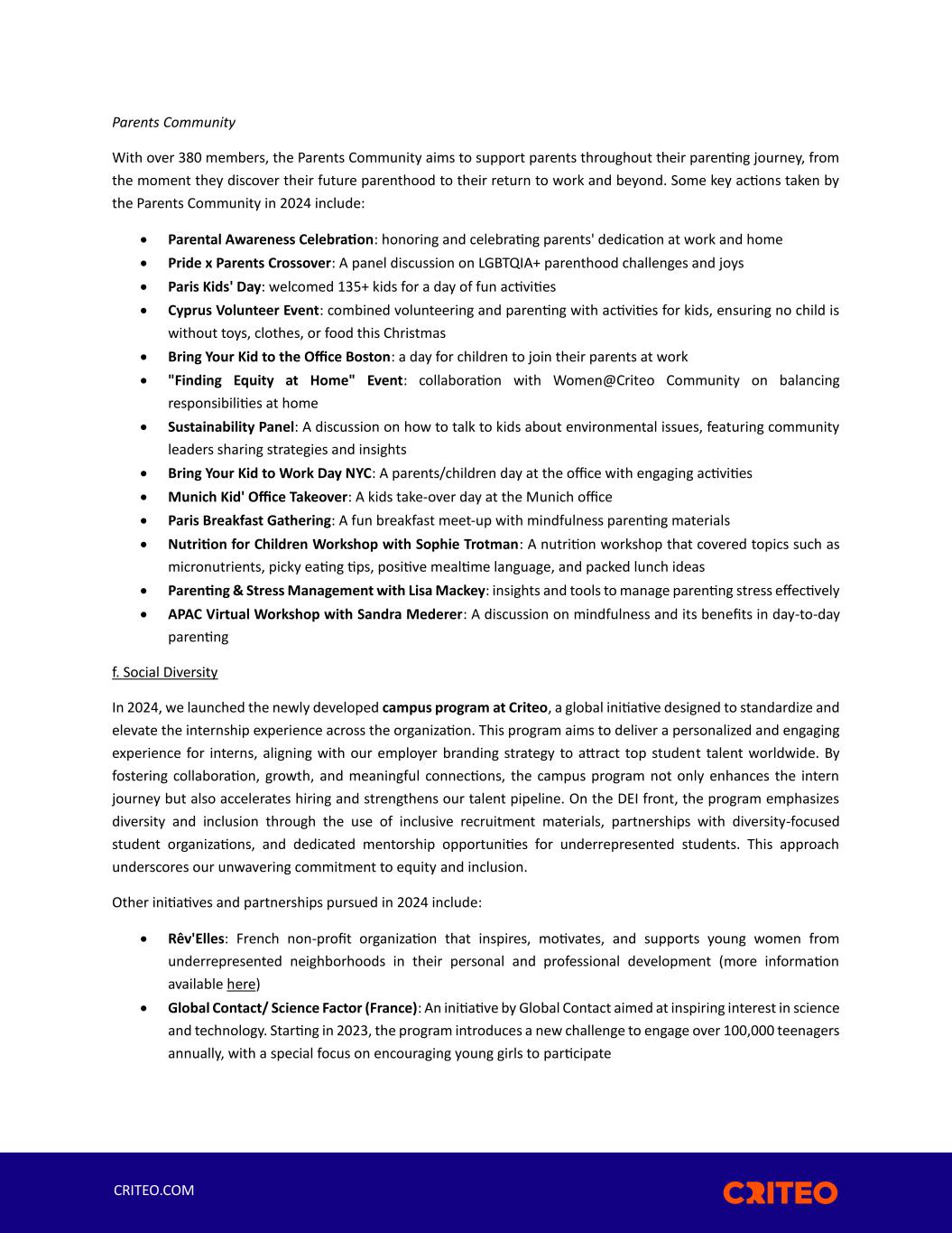 CRITEO.COM Parents Community With over 380 members, the Parents Community aims to support parents throughout their parenting journey, from the moment they discover their future parenthood to their return to work and beyond. Some key actions taken by the Parents Community in 2024 include: • Parental Awareness Celebration: honoring and celebrating parents' dedication at work and home • Pride x Parents Crossover: A panel discussion on LGBTQIA+ parenthood challenges and joys • Paris Kids' Day: welcomed 135+ kids for a day of fun activities • Cyprus Volunteer Event: combined volunteering and parenting with activities for kids, ensuring no child is without toys, clothes, or food this Christmas • Bring Your Kid to the Office Boston: a day for children to join their parents at work • "Finding Equity at Home" Event: collaboration with Women@Criteo Community on balancing responsibilities at home • Sustainability Panel: A discussion on how to talk to kids about environmental issues, featuring community leaders sharing strategies and insights • Bring Your Kid to Work Day NYC: A parents/children day at the office with engaging activities • Munich Kid' Office Takeover: A kids take-over day at the Munich office • Paris Breakfast Gathering: A fun breakfast meet-up with mindfulness parenting materials • Nutrition for Children Workshop with Sophie Trotman: A nutrition workshop that covered topics such as micronutrients, picky eating tips, positive mealtime language, and packed lunch ideas • Parenting & Stress Management with Lisa Mackey: insights and tools to manage parenting stress effectively • APAC Virtual Workshop with Sandra Mederer: A discussion on mindfulness and its benefits in day-to-day parenting f. Social Diversity In 2024, we launched the newly developed campus program at Criteo, a global initiative designed to standardize and elevate the internship experience across the organization. This program aims to deliver a personalized and engaging experience for interns, aligning with our employer branding strategy to attract top student talent worldwide. By fostering collaboration, growth, and meaningful connections, the campus program not only enhances the intern journey but also accelerates hiring and strengthens our talent pipeline. On the DEI front, the program emphasizes diversity and inclusion through the use of inclusive recruitment materials, partnerships with diversity-focused student organizations, and dedicated mentorship opportunities for underrepresented students. This approach underscores our unwavering commitment to equity and inclusion. Other initiatives and partnerships pursued in 2024 include: • Rêv'Elles: French non-profit organization that inspires, motivates, and supports young women from underrepresented neighborhoods in their personal and professional development (more information available here) • Global Contact/ Science Factor (France): An initiative by Global Contact aimed at inspiring interest in science and technology. Starting in 2023, the program introduces a new challenge to engage over 100,000 teenagers annually, with a special focus on encouraging young girls to participate