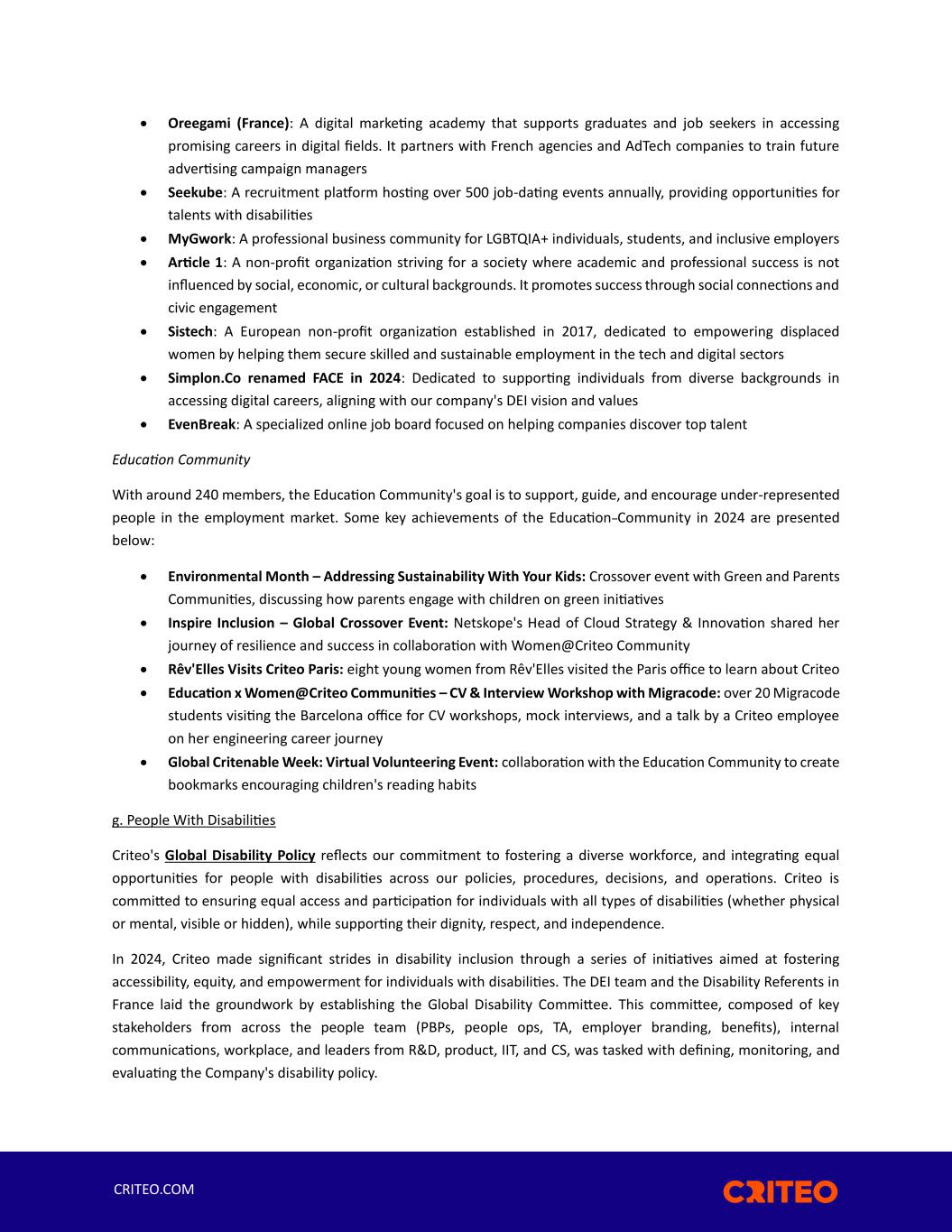 CRITEO.COM • Oreegami (France): A digital marketing academy that supports graduates and job seekers in accessing promising careers in digital fields. It partners with French agencies and AdTech companies to train future advertising campaign managers • Seekube: A recruitment platform hosting over 500 job-dating events annually, providing opportunities for talents with disabilities • MyGwork: A professional business community for LGBTQIA+ individuals, students, and inclusive employers • Article 1: A non-profit organization striving for a society where academic and professional success is not influenced by social, economic, or cultural backgrounds. It promotes success through social connections and civic engagement • Sistech: A European non-profit organization established in 2017, dedicated to empowering displaced women by helping them secure skilled and sustainable employment in the tech and digital sectors • Simplon.Co renamed FACE in 2024: Dedicated to supporting individuals from diverse backgrounds in accessing digital careers, aligning with our company's DEI vision and values • EvenBreak: A specialized online job board focused on helping companies discover top talent Education Community With around 240 members, the Education Community's goal is to support, guide, and encourage under-represented people in the employment market. Some key achievements of the Education Community in 2024 are presented below: • Environmental Month – Addressing Sustainability With Your Kids: Crossover event with Green and Parents Communities, discussing how parents engage with children on green initiatives • Inspire Inclusion – Global Crossover Event: Netskope's Head of Cloud Strategy & Innovation shared her journey of resilience and success in collaboration with Women@Criteo Community • Rêv'Elles Visits Criteo Paris: eight young women from Rêv'Elles visited the Paris office to learn about Criteo • Education x Women@Criteo Communities – CV & Interview Workshop with Migracode: over 20 Migracode students visiting the Barcelona office for CV workshops, mock interviews, and a talk by a Criteo employee on her engineering career journey • Global Critenable Week: Virtual Volunteering Event: collaboration with the Education Community to create bookmarks encouraging children's reading habits g. People With Disabilities Criteo's Global Disability Policy reflects our commitment to fostering a diverse workforce, and integrating equal opportunities for people with disabilities across our policies, procedures, decisions, and operations. Criteo is committed to ensuring equal access and participation for individuals with all types of disabilities (whether physical or mental, visible or hidden), while supporting their dignity, respect, and independence. In 2024, Criteo made significant strides in disability inclusion through a series of initiatives aimed at fostering accessibility, equity, and empowerment for individuals with disabilities. The DEI team and the Disability Referents in France laid the groundwork by establishing the Global Disability Committee. This committee, composed of key stakeholders from across the people team (PBPs, people ops, TA, employer branding, benefits), internal communications, workplace, and leaders from R&D, product, IIT, and CS, was tasked with defining, monitoring, and evaluating the Company's disability policy.