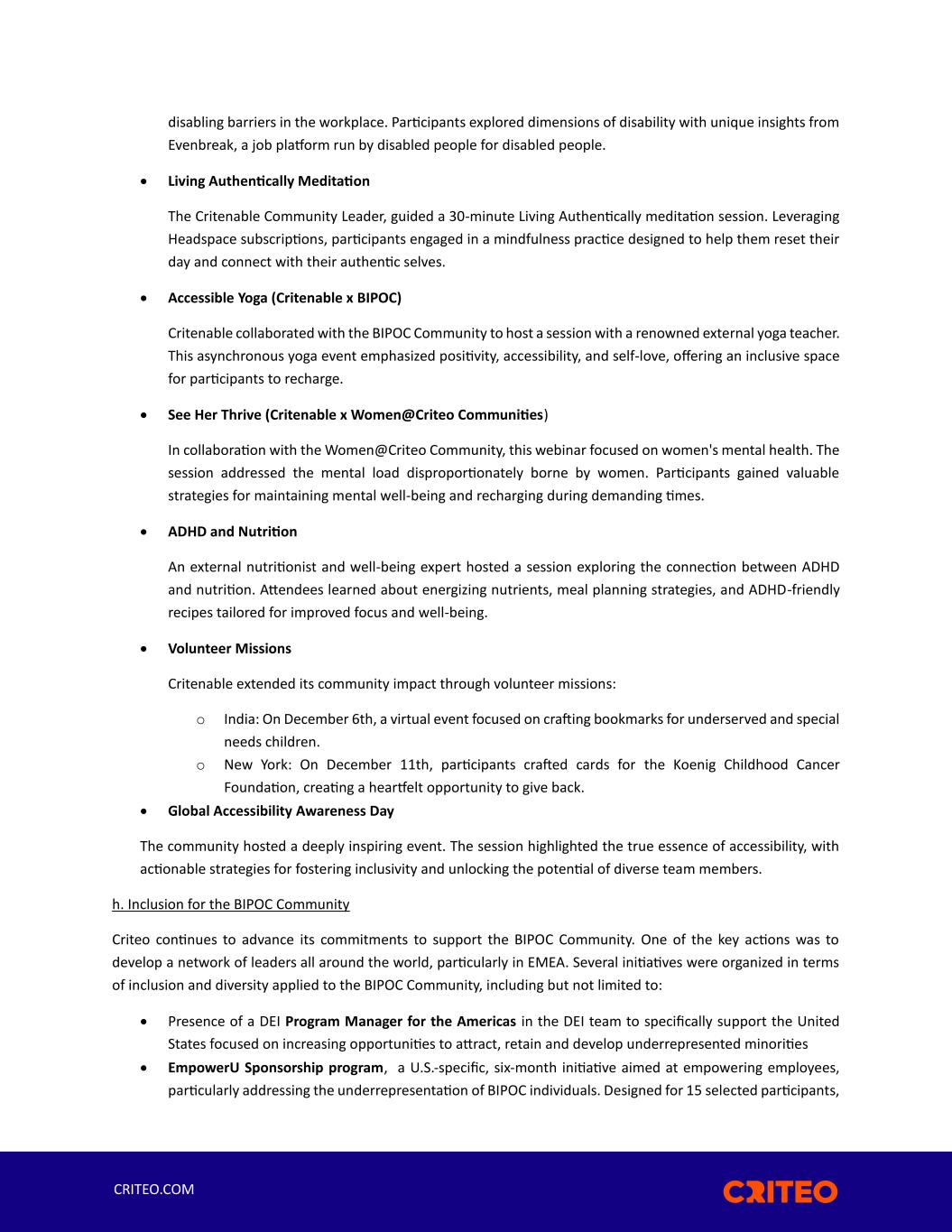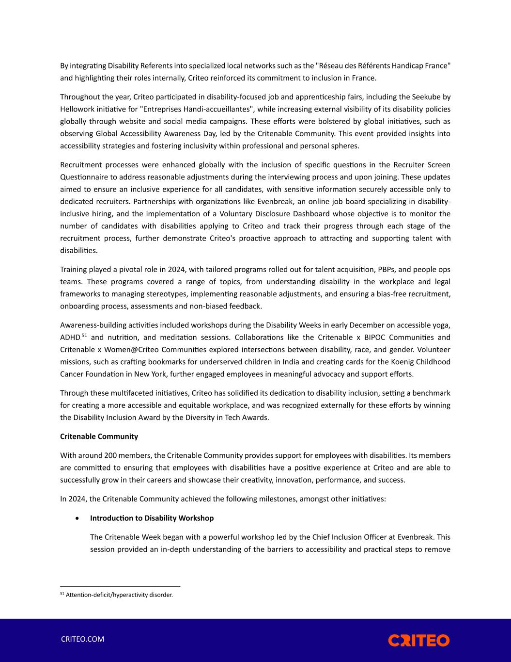 CRITEO.COM By integrating Disability Referents into specialized local networks such as the "Réseau des Référents Handicap France" and highlighting their roles internally, Criteo reinforced its commitment to inclusion in France. Throughout the year, Criteo participated in disability-focused job and apprenticeship fairs, including the Seekube by Hellowork initiative for "Entreprises Handi-accueillantes", while increasing external visibility of its disability policies globally through website and social media campaigns. These efforts were bolstered by global initiatives, such as observing Global Accessibility Awareness Day, led by the Critenable Community. This event provided insights into accessibility strategies and fostering inclusivity within professional and personal spheres. Recruitment processes were enhanced globally with the inclusion of specific questions in the Recruiter Screen Questionnaire to address reasonable adjustments during the interviewing process and upon joining. These updates aimed to ensure an inclusive experience for all candidates, with sensitive information securely accessible only to dedicated recruiters. Partnerships with organizations like Evenbreak, an online job board specializing in disability- inclusive hiring, and the implementation of a Voluntary Disclosure Dashboard whose objective is to monitor the number of candidates with disabilities applying to Criteo and track their progress through each stage of the recruitment process, further demonstrate Criteo's proactive approach to attracting and supporting talent with disabilities. Training played a pivotal role in 2024, with tailored programs rolled out for talent acquisition, PBPs, and people ops teams. These programs covered a range of topics, from understanding disability in the workplace and legal frameworks to managing stereotypes, implementing reasonable adjustments, and ensuring a bias-free recruitment, onboarding process, assessments and non-biased feedback. Awareness-building activities included workshops during the Disability Weeks in early December on accessible yoga, ADHD50F 51 and nutrition, and meditation sessions. Collaborations like the Critenable x BIPOC Communities and Critenable x Women@Criteo Communities explored intersections between disability, race, and gender. Volunteer missions, such as crafting bookmarks for underserved children in India and creating cards for the Koenig Childhood Cancer Foundation in New York, further engaged employees in meaningful advocacy and support efforts. Through these multifaceted initiatives, Criteo has solidified its dedication to disability inclusion, setting a benchmark for creating a more accessible and equitable workplace, and was recognized externally for these efforts by winning the Disability Inclusion Award by the Diversity in Tech Awards. Critenable Community With around 200 members, the Critenable Community provides support for employees with disabilities. Its members are committed to ensuring that employees with disabilities have a positive experience at Criteo and are able to successfully grow in their careers and showcase their creativity, innovation, performance, and success. In 2024, the Critenable Community achieved the following milestones, amongst other initiatives: • Introduction to Disability Workshop The Critenable Week began with a powerful workshop led by the Chief Inclusion Officer at Evenbreak. This session provided an in-depth understanding of the barriers to accessibility and practical steps to remove 51 Attention-deficit/hyperactivity disorder.