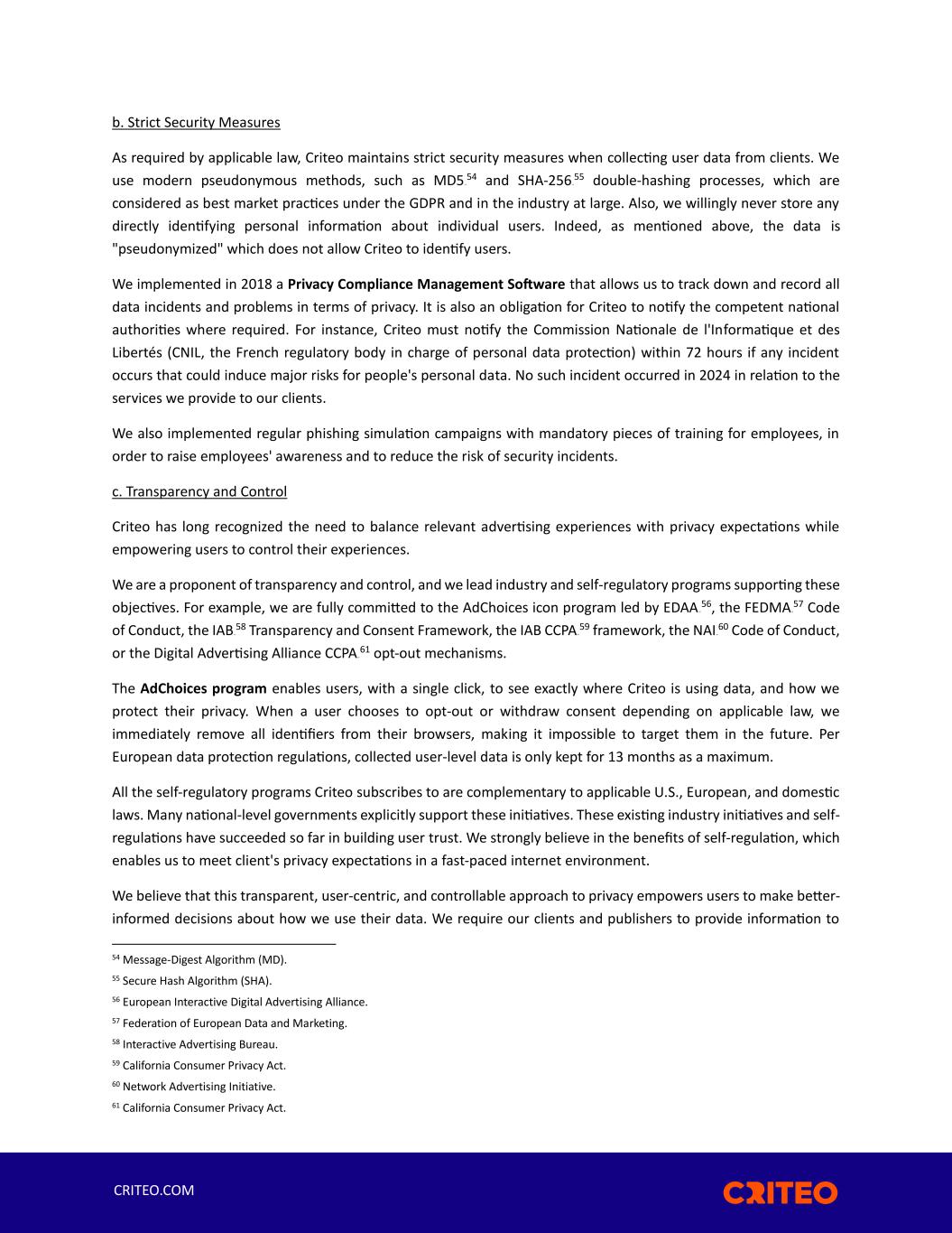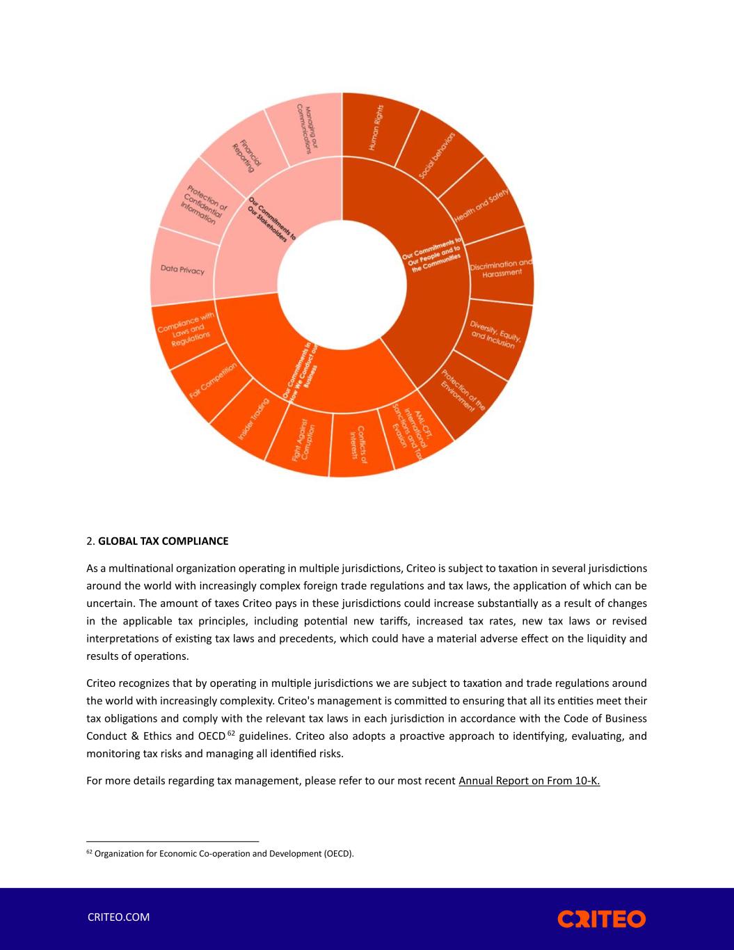 CRITEO.COM 1. Dialogue with Clients ................................................................................................................................. 104 2. Ethics in Our Ads ........................................................................................................................................ 104 3. Data Privacy and Information Security ...................................................................................................... 106 Governance......................................................................................................................................................... 109 VI. Operating Responsibly ................................................................................................................................. 111 1. Code of Business Conduct & Ethics ............................................................................................................ 111 2. Global Tax Compliance ............................................................................................................................... 112 3. Anti-Corruption .......................................................................................................................................... 113 4. Whistleblowing and Alert Mechanisms ..................................................................................................... 114 Appendix ............................................................................................................................................................. 115 CSRD Concordance Table .................................................................................................................................. 115 UNSDGs Concordance Table ............................................................................................................................. 119 TCFD Concordance Table ................................................................................................................................... 121 SASB Concordance Table ................................................................................................................................... 124 Methodological Note ........................................................................................................................................ 126