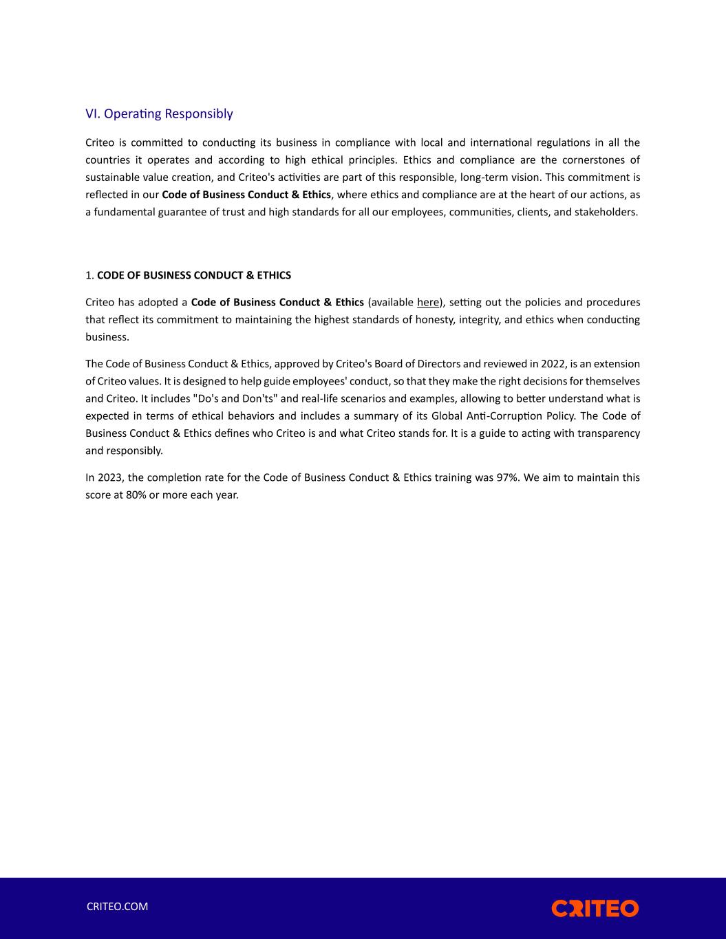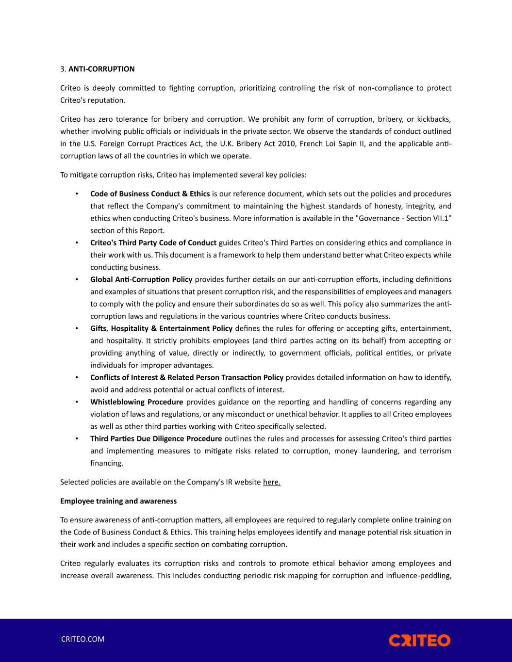 CRITEO.COM 3. ANTI-CORRUPTION Criteo is deeply committed to fighting corruption, prioritizing controlling the risk of non-compliance to protect Criteo's reputation. Criteo has zero tolerance for bribery and corruption. We prohibit any form of corruption, bribery, or kickbacks, whether involving public officials or individuals in the private sector. We observe the standards of conduct outlined in the U.S. Foreign Corrupt Practices Act, the U.K. Bribery Act 2010, French Loi Sapin II, and the applicable anti- corruption laws of all the countries in which we operate. To mitigate corruption risks, Criteo has implemented several key policies: • Code of Business Conduct & Ethics is our reference document, which sets out the policies and procedures that reflect the Company's commitment to maintaining the highest standards of honesty, integrity, and ethics when conducting Criteo's business. More information is available in the "Governance - Section VII.1" section of this Report. • Criteo's Third Party Code of Conduct guides Criteo's Third Parties on considering ethics and compliance in their work with us. This document is a framework to help them understand better what Criteo expects while conducting business. • Global Anti-Corruption Policy provides further details on our anti-corruption efforts, including definitions and examples of situations that present corruption risk, and the responsibilities of employees and managers to comply with the policy and ensure their subordinates do so as well. This policy also summarizes the anti- corruption laws and regulations in the various countries where Criteo conducts business. • Gifts, Hospitality & Entertainment Policy defines the rules for offering or accepting gifts, entertainment, and hospitality. It strictly prohibits employees (and third parties acting on its behalf) from accepting or providing anything of value, directly or indirectly, to government officials, political entities, or private individuals for improper advantages. • Conflicts of Interest & Related Person Transaction Policy provides detailed information on how to identify, avoid and address potential or actual conflicts of interest. • Whistleblowing Procedure provides guidance on the reporting and handling of concerns regarding any violation of laws and regulations, or any misconduct or unethical behavior. It applies to all Criteo employees as well as other third parties working with Criteo specifically selected. • Third Parties Due Diligence Procedure outlines the rules and processes for assessing Criteo's third parties and implementing measures to mitigate risks related to corruption, money laundering, and terrorism financing. Selected policies are available on the Company's IR website here. Employee training and awareness To ensure awareness of anti-corruption matters, all employees are required to regularly complete online training on the Code of Business Conduct & Ethics. This training helps employees identify and manage potential risk situation in their work and includes a specific section on combating corruption. Criteo regularly evaluates its corruption risks and controls to promote ethical behavior among employees and increase overall awareness. This includes conducting periodic risk mapping for corruption and influence-peddling,