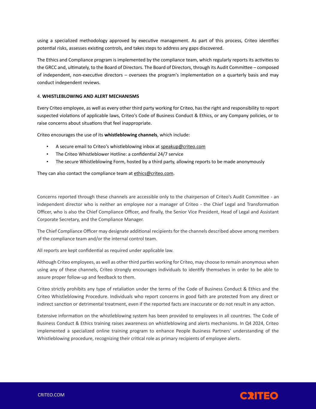 CRITEO.COM using a specialized methodology approved by executive management. As part of this process, Criteo identifies potential risks, assesses existing controls, and takes steps to address any gaps discovered. The Ethics and Compliance program is implemented by the compliance team, which regularly reports its activities to the GRCC and, ultimately, to the Board of Directors. The Board of Directors, through its Audit Committee – composed of independent, non-executive directors – oversees the program's implementation on a quarterly basis and may conduct independent reviews. 4. WHISTLEBLOWING AND ALERT MECHANISMS Every Criteo employee, as well as every other third party working for Criteo, has the right and responsibility to report suspected violations of applicable laws, Criteo's Code of Business Conduct & Ethics, or any Company policies, or to raise concerns about situations that feel inappropriate. Criteo encourages the use of its whistleblowing channels, which include: • A secure email to Criteo's whistleblowing inbox at speakup@criteo.com • The Criteo Whistleblower Hotline: a confidential 24/7 service • The secure Whistleblowing Form, hosted by a third party, allowing reports to be made anonymously They can also contact the compliance team at ethics@criteo.com. Concerns reported through these channels are accessible only to the chairperson of Criteo's Audit Committee - an independent director who is neither an employee nor a manager of Criteo - the Chief Legal and Transformation Officer, who is also the Chief Compliance Officer, and finally, the Senior Vice President, Head of Legal and Assistant Corporate Secretary, and the Compliance Manager. The Chief Compliance Officer may designate additional recipients for the channels described above among members of the compliance team and/or the internal control team. All reports are kept confidential as required under applicable law. Although Criteo employees, as well as other third parties working for Criteo, may choose to remain anonymous when using any of these channels, Criteo strongly encourages individuals to identify themselves in order to be able to assure proper follow-up and feedback to them. Criteo strictly prohibits any type of retaliation under the terms of the Code of Business Conduct & Ethics and the Criteo Whistleblowing Procedure. Individuals who report concerns in good faith are protected from any direct or indirect sanction or detrimental treatment, even if the reported facts are inaccurate or do not result in any action. Extensive information on the whistleblowing system has been provided to employees in all countries. The Code of Business Conduct & Ethics training raises awareness on whistleblowing and alerts mechanisms. In Q4 2024, Criteo implemented a specialized online training program to enhance People Business Partners' understanding of the Whistleblowing procedure, recognizing their critical role as primary recipients of employee alerts.