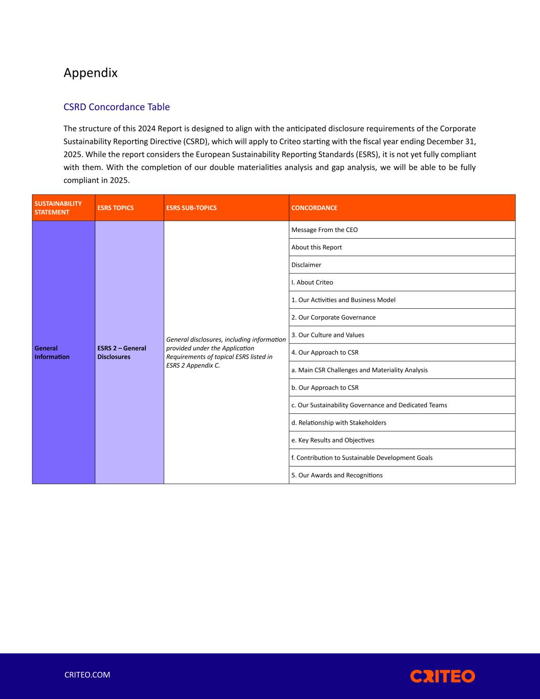 CRITEO.COM Appendix CSRD Concordance Table The structure of this 2024 Report is designed to align with the anticipated disclosure requirements of the Corporate Sustainability Reporting Directive (CSRD), which will apply to Criteo starting with the fiscal year ending December 31, 2025. While the report considers the European Sustainability Reporting Standards (ESRS), it is not yet fully compliant with them. With the completion of our double materialities analysis and gap analysis, we will be able to be fully compliant in 2025. SUSTAINABILITY STATEMENT ESRS TOPICS ESRS SUB-TOPICS CONCORDANCE General Information ESRS 2 – General Disclosures General disclosures, including information provided under the Application Requirements of topical ESRS listed in ESRS 2 Appendix C. Message From the CEO About this Report Disclaimer I. About Criteo 1. Our Activities and Business Model 2. Our Corporate Governance 3. Our Culture and Values 4. Our Approach to CSR a. Main CSR Challenges and Materiality Analysis b. Our Approach to CSR c. Our Sustainability Governance and Dedicated Teams d. Relationship with Stakeholders e. Key Results and Objectives f. Contribution to Sustainable Development Goals 5. Our Awards and Recognitions