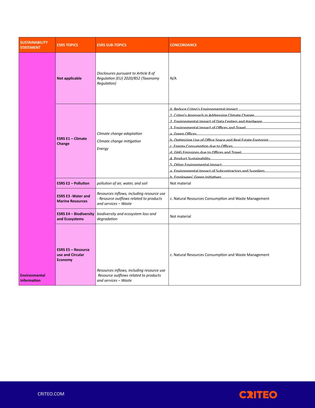 CRITEO.COM SUSTAINABILITY STATEMENT ESRS TOPICS ESRS SUB-TOPICS CONCORDANCE Environmental Information Not applicable Disclosures pursuant to Article 8 of Regulation (EU) 2020/852 (Taxonomy Regulation) N/A ESRS E1 – Climate Change Climate change adaptation Climate change mitigation Energy II. Reduce Criteo's Environmental Impact 1. Criteo's Approach in Addressing Climate Change 2. Environmental Impact of Data Centers and Hardware 3. Environmental Impact of Offices and Travel a. Green Offices b. Optimizing Use of Office Space and Real Estate Footprint c. Energy Consumption due to Offices d. GHG Emissions due to Offices and Travel 4. Product Sustainability 5. Other Environmental Impact a. Environmental Impact of Subcontractors and Suppliers b. Employees' Green Initiatives ESRS E2 – Pollution pollution of air, water, and soil Not material ESRS E3 -Water and Marine Resources Resources inflows, including resource use - Resource outflows related to products and services – Waste c. Natural Resources Consumption and Waste Management ESRS E4 – Biodiversity and Ecosystems biodiversity and ecosystem loss and degradation Not material ESRS E5 – Resource use and Circular Economy Resources inflows, including resource use Resource outflows related to products and services – Waste c. Natural Resources Consumption and Waste Management