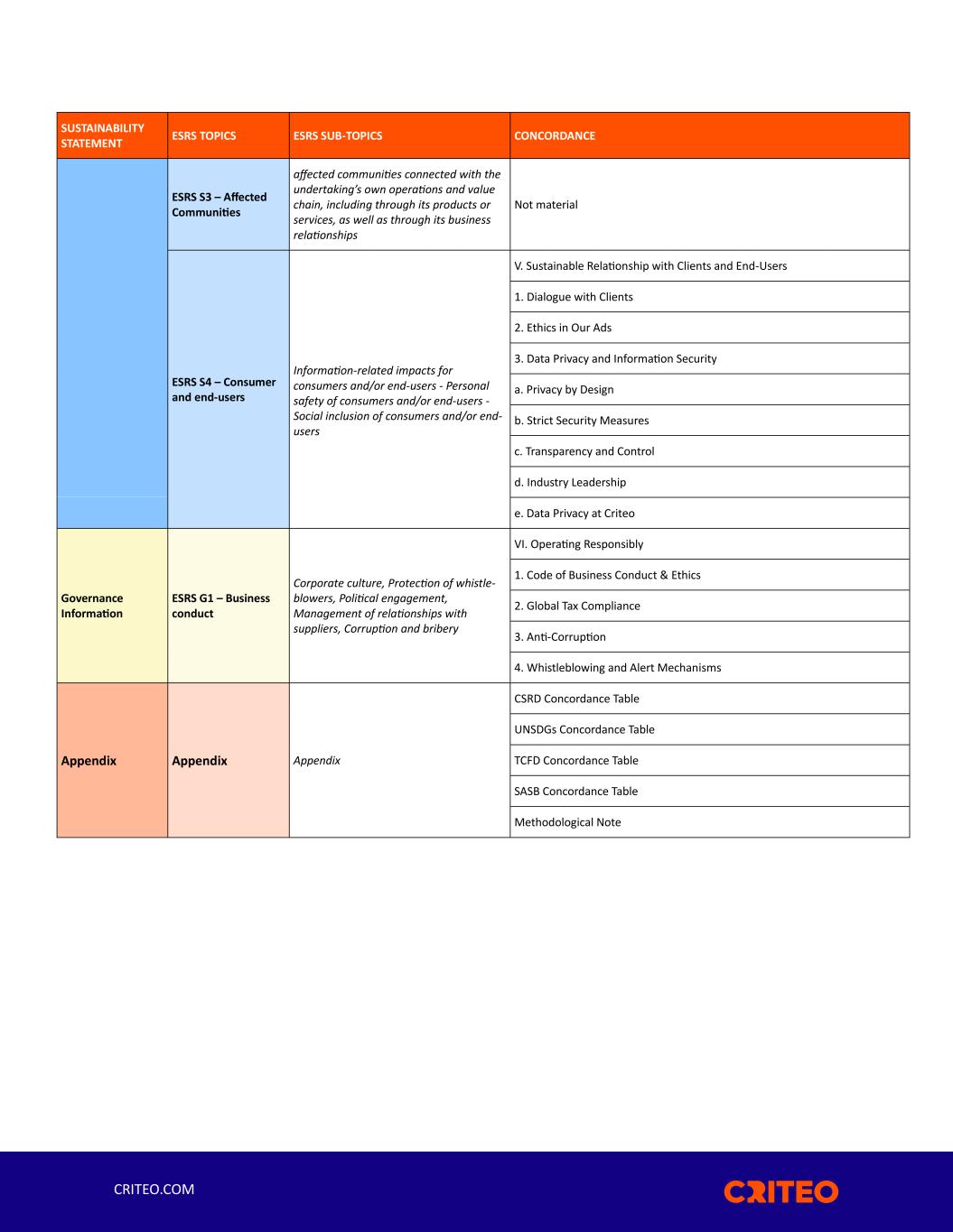 CRITEO.COM SUSTAINABILITY STATEMENT ESRS TOPICS ESRS SUB-TOPICS CONCORDANCE ESRS S3 – Affected Communities affected communities connected with the undertaking’s own operations and value chain, including through its products or services, as well as through its business relationships Not material ESRS S4 – Consumer and end-users Information-related impacts for consumers and/or end-users - Personal safety of consumers and/or end-users - Social inclusion of consumers and/or end- users V. Sustainable Relationship with Clients and End-Users 1. Dialogue with Clients 2. Ethics in Our Ads 3. Data Privacy and Information Security a. Privacy by Design b. Strict Security Measures c. Transparency and Control d. Industry Leadership e. Data Privacy at Criteo Governance Information ESRS G1 – Business conduct Corporate culture, Protection of whistle- blowers, Political engagement, Management of relationships with suppliers, Corruption and bribery VI. Operating Responsibly 1. Code of Business Conduct & Ethics 2. Global Tax Compliance 3. Anti-Corruption 4. Whistleblowing and Alert Mechanisms Appendix Appendix Appendix CSRD Concordance Table UNSDGs Concordance Table TCFD Concordance Table SASB Concordance Table Methodological Note