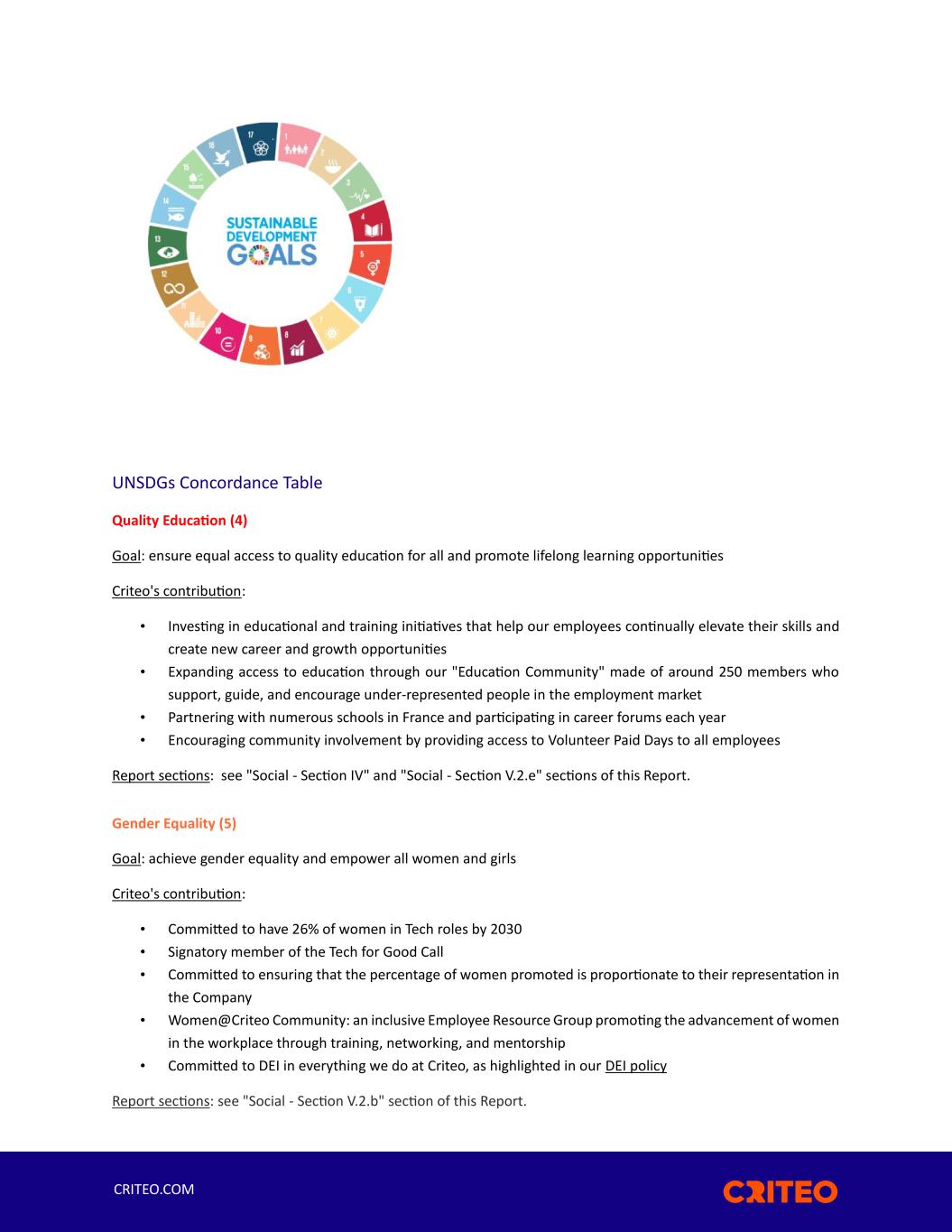 CRITEO.COM UNSDGs Concordance Table Quality Education (4) Goal: ensure equal access to quality education for all and promote lifelong learning opportunities Criteo's contribution: • Investing in educational and training initiatives that help our employees continually elevate their skills and create new career and growth opportunities • Expanding access to education through our "Education Community" made of around 250 members who support, guide, and encourage under-represented people in the employment market • Partnering with numerous schools in France and participating in career forums each year • Encouraging community involvement by providing access to Volunteer Paid Days to all employees Report sections: see "Social - Section IV" and "Social - Section V.2.e" sections of this Report. Gender Equality (5) Goal: achieve gender equality and empower all women and girls Criteo's contribution: • Committed to have 26% of women in Tech roles by 2030 • Signatory member of the Tech for Good Call • Committed to ensuring that the percentage of women promoted is proportionate to their representation in the Company • Women@Criteo Community: an inclusive Employee Resource Group promoting the advancement of women in the workplace through training, networking, and mentorship • Committed to DEI in everything we do at Criteo, as highlighted in our DEI policy Report sections: see "Social - Section V.2.b" section of this Report.