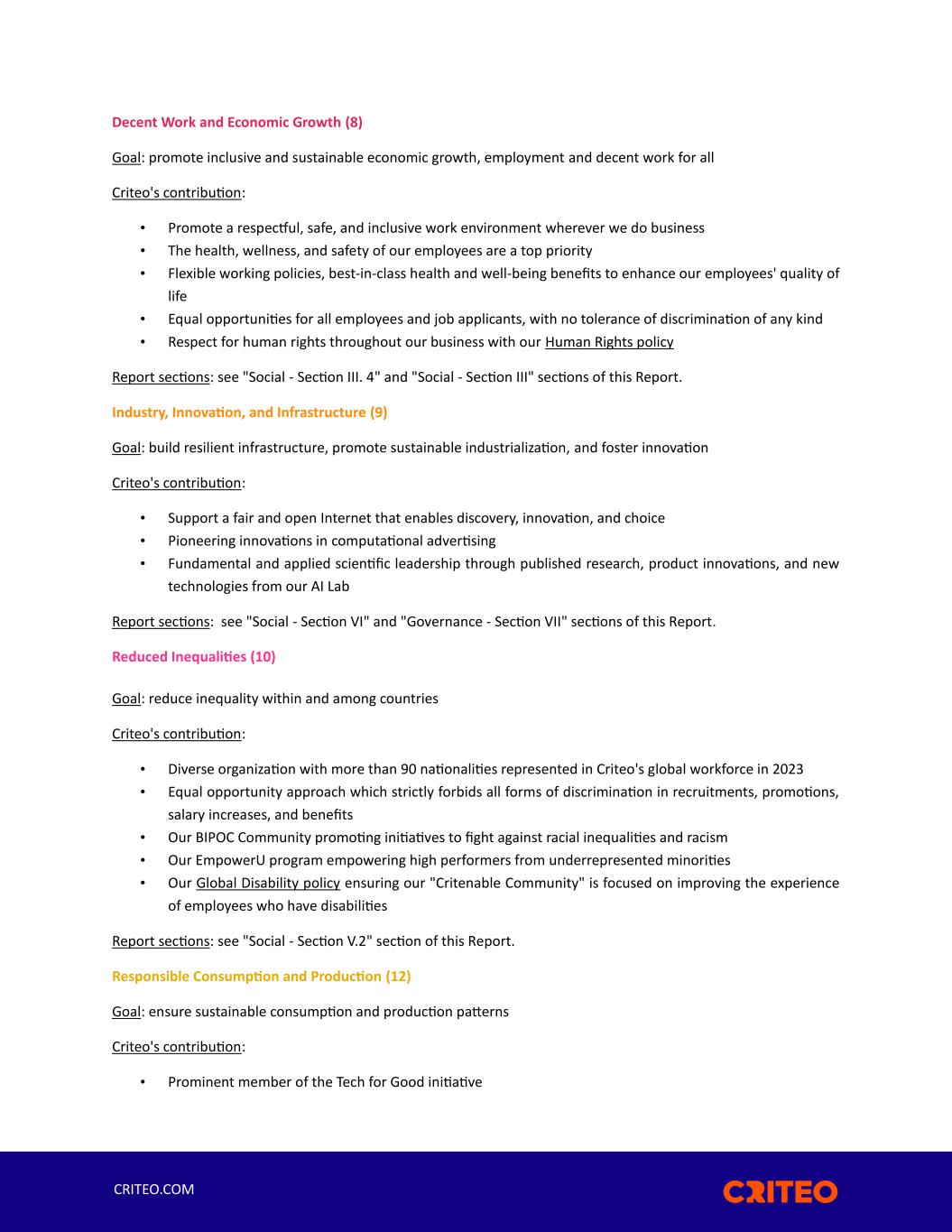 CRITEO.COM Decent Work and Economic Growth (8) Goal: promote inclusive and sustainable economic growth, employment and decent work for all Criteo's contribution: • Promote a respectful, safe, and inclusive work environment wherever we do business • The health, wellness, and safety of our employees are a top priority • Flexible working policies, best-in-class health and well-being benefits to enhance our employees' quality of life • Equal opportunities for all employees and job applicants, with no tolerance of discrimination of any kind • Respect for human rights throughout our business with our Human Rights policy Report sections: see "Social - Section III. 4" and "Social - Section III" sections of this Report. Industry, Innovation, and Infrastructure (9) Goal: build resilient infrastructure, promote sustainable industrialization, and foster innovation Criteo's contribution: • Support a fair and open Internet that enables discovery, innovation, and choice • Pioneering innovations in computational advertising • Fundamental and applied scientific leadership through published research, product innovations, and new technologies from our AI Lab Report sections: see "Social - Section VI" and "Governance - Section VII" sections of this Report. Reduced Inequalities (10) Goal: reduce inequality within and among countries Criteo's contribution: • Diverse organization with more than 90 nationalities represented in Criteo's global workforce in 2023 • Equal opportunity approach which strictly forbids all forms of discrimination in recruitments, promotions, salary increases, and benefits • Our BIPOC Community promoting initiatives to fight against racial inequalities and racism • Our EmpowerU program empowering high performers from underrepresented minorities • Our Global Disability policy ensuring our "Critenable Community" is focused on improving the experience of employees who have disabilities Report sections: see "Social - Section V.2" section of this Report. Responsible Consumption and Production (12) Goal: ensure sustainable consumption and production patterns Criteo's contribution: • Prominent member of the Tech for Good initiative