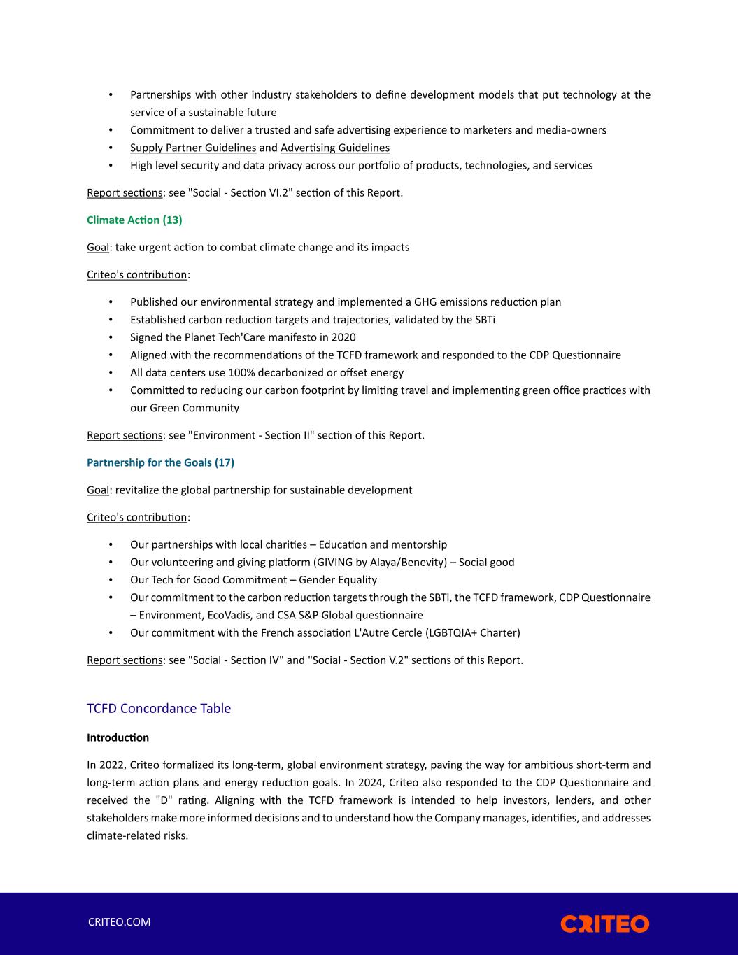 CRITEO.COM • Partnerships with other industry stakeholders to define development models that put technology at the service of a sustainable future • Commitment to deliver a trusted and safe advertising experience to marketers and media-owners • Supply Partner Guidelines and Advertising Guidelines • High level security and data privacy across our portfolio of products, technologies, and services Report sections: see "Social - Section VI.2" section of this Report. Climate Action (13) Goal: take urgent action to combat climate change and its impacts Criteo's contribution: • Published our environmental strategy and implemented a GHG emissions reduction plan • Established carbon reduction targets and trajectories, validated by the SBTi • Signed the Planet Tech'Care manifesto in 2020 • Aligned with the recommendations of the TCFD framework and responded to the CDP Questionnaire • All data centers use 100% decarbonized or offset energy • Committed to reducing our carbon footprint by limiting travel and implementing green office practices with our Green Community Report sections: see "Environment - Section II" section of this Report. Partnership for the Goals (17) Goal: revitalize the global partnership for sustainable development Criteo's contribution: • Our partnerships with local charities – Education and mentorship • Our volunteering and giving platform (GIVING by Alaya/Benevity) – Social good • Our Tech for Good Commitment – Gender Equality • Our commitment to the carbon reduction targets through the SBTi, the TCFD framework, CDP Questionnaire – Environment, EcoVadis, and CSA S&P Global questionnaire • Our commitment with the French association L'Autre Cercle (LGBTQIA+ Charter) Report sections: see "Social - Section IV" and "Social - Section V.2" sections of this Report. TCFD Concordance Table Introduction In 2022, Criteo formalized its long-term, global environment strategy, paving the way for ambitious short-term and long-term action plans and energy reduction goals. In 2024, Criteo also responded to the CDP Questionnaire and received the "D" rating. Aligning with the TCFD framework is intended to help investors, lenders, and other stakeholders make more informed decisions and to understand how the Company manages, identifies, and addresses climate-related risks.