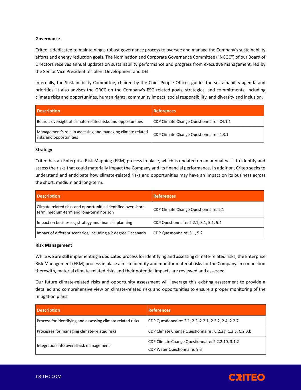 CRITEO.COM Governance Criteo is dedicated to maintaining a robust governance process to oversee and manage the Company's sustainability efforts and energy reduction goals. The Nomination and Corporate Governance Committee ("NCGC") of our Board of Directors receives annual updates on sustainability performance and progress from executive management, led by the Senior Vice President of Talent Development and DEI. Internally, the Sustainability Committee, chaired by the Chief People Officer, guides the sustainability agenda and priorities. It also advises the GRCC on the Company's ESG-related goals, strategies, and commitments, including climate risks and opportunities, human rights, community impact, social responsibility, and diversity and inclusion. Description References Board's oversight of climate-related risks and opportunities CDP Climate Change Questionnaire : C4.1.1 Management's role in assessing and managing climate related risks and opportunities CDP Climate Change Questionnaire : 4.3.1 Strategy Criteo has an Enterprise Risk Mapping (ERM) process in place, which is updated on an annual basis to identify and assess the risks that could materially impact the Company and its financial performance. In addition, Criteo seeks to understand and anticipate how climate-related risks and opportunities may have an impact on its business across the short, medium and long-term. Description References Climate related risks and opportunities identified over short- term, medium-term and long-term horizon CDP Climate Change Questionnaire: 2.1 Impact on businesses, strategy and financial planning CDP Questionnaire: 2.2.1, 3.1, 5.1, 5.4 Impact of different scenarios, including a 2 degree C scenario CDP Questionnaire: 5.1, 5.2 Risk Management While we are still implementing a dedicated process for identifying and assessing climate-related risks, the Enterprise Risk Management (ERM) process in place aims to identify and monitor material risks for the Company. In connection therewith, material climate-related risks and their potential impacts are reviewed and assessed. Our future climate-related risks and opportunity assessment will leverage this existing assessment to provide a detailed and comprehensive view on climate-related risks and opportunities to ensure a proper monitoring of the mitigation plans. Description References Process for identifying and assessing climate related risks CDP Questionnaire: 2.1, 2.2, 2.2.1, 2.2.2, 2.4, 2.2.7 Processes for managing climate-related risks CDP Climate Change Questionnaire : C.2.2g, C.2.3, C.2.3.b Integration into overall risk management CDP Climate Change Questionnaire: 2.2.2.10, 3.1.2 CDP Water Questionnaire: 9.3