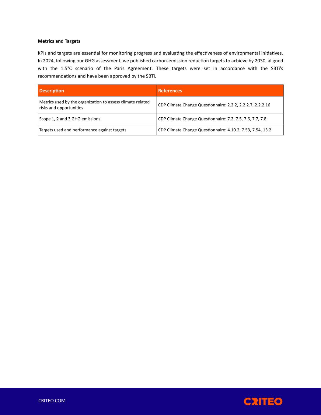 CRITEO.COM Metrics and Targets KPIs and targets are essential for monitoring progress and evaluating the effectiveness of environmental initiatives. In 2024, following our GHG assessment, we published carbon-emission reduction targets to achieve by 2030, aligned with the 1.5°C scenario of the Paris Agreement. These targets were set in accordance with the SBTi's recommendations and have been approved by the SBTi. Description References Metrics used by the organization to assess climate related risks and opportunities CDP Climate Change Questionnaire: 2.2.2, 2.2.2.7, 2.2.2.16 Scope 1, 2 and 3 GHG emissions CDP Climate Change Questionnaire: 7.2, 7.5, 7.6, 7.7, 7.8 Targets used and performance against targets CDP Climate Change Questionnaire: 4.10.2, 7.53, 7.54, 13.2
