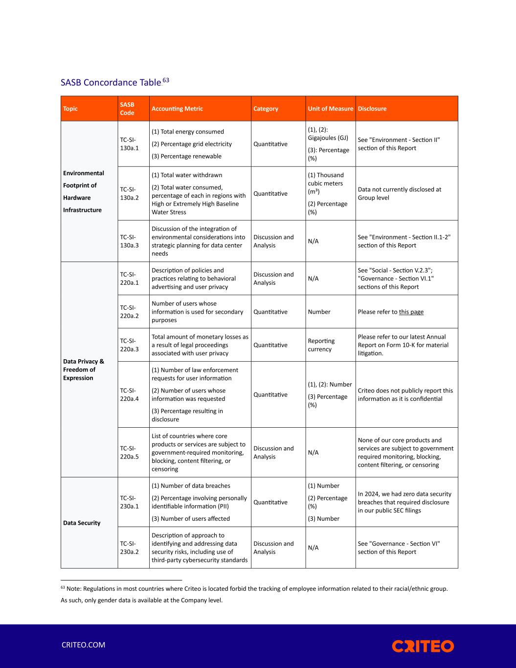 CRITEO.COM SASB Concordance Table62F 63 Topic SASB Code Accounting Metric Category Unit of Measure Disclosure Environmental Footprint of Hardware Infrastructure TC-SI- 130a.1 (1) Total energy consumed (2) Percentage grid electricity (3) Percentage renewable Quantitative (1), (2): Gigajoules (GJ) (3): Percentage (%) See "Environment - Section II" section of this Report TC-SI- 130a.2 (1) Total water withdrawn (2) Total water consumed, percentage of each in regions with High or Extremely High Baseline Water Stress Quantitative (1) Thousand cubic meters (m³) (2) Percentage (%) Data not currently disclosed at Group level TC-SI- 130a.3 Discussion of the integration of environmental considerations into strategic planning for data center needs Discussion and Analysis N/A See "Environment - Section II.1-2" section of this Report Data Privacy & Freedom of Expression TC-SI- 220a.1 Description of policies and practices relating to behavioral advertising and user privacy Discussion and Analysis N/A See "Social - Section V.2.3"; "Governance - Section VI.1" sections of this Report TC-SI- 220a.2 Number of users whose information is used for secondary purposes Quantitative Number Please refer to this page TC-SI- 220a.3 Total amount of monetary losses as a result of legal proceedings associated with user privacy Quantitative Reporting currency Please refer to our latest Annual Report on Form 10-K for material litigation. TC-SI- 220a.4 (1) Number of law enforcement requests for user information (2) Number of users whose information was requested (3) Percentage resulting in disclosure Quantitative (1), (2): Number (3) Percentage (%) Criteo does not publicly report this information as it is confidential TC-SI- 220a.5 List of countries where core products or services are subject to government-required monitoring, blocking, content filtering, or censoring Discussion and Analysis N/A None of our core products and services are subject to government required monitoring, blocking, content filtering, or censoring Data Security TC-SI- 230a.1 (1) Number of data breaches (2) Percentage involving personally identifiable information (PII) (3) Number of users affected Quantitative (1) Number (2) Percentage (%) (3) Number In 2024, we had zero data security breaches that required disclosure in our public SEC filings TC-SI- 230a.2 Description of approach to identifying and addressing data security risks, including use of third-party cybersecurity standards Discussion and Analysis N/A See "Governance - Section VI" section of this Report 63 Note: Regulations in most countries where Criteo is located forbid the tracking of employee information related to their racial/ethnic group. As such, only gender data is available at the Company level.