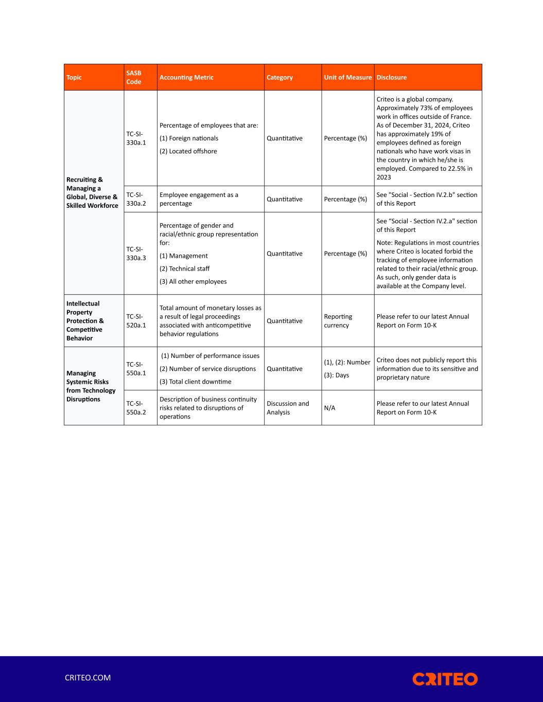 CRITEO.COM Topic SASB Code Accounting Metric Category Unit of Measure Disclosure Recruiting & Managing a Global, Diverse & Skilled Workforce TC-SI- 330a.1 Percentage of employees that are: (1) Foreign nationals (2) Located offshore Quantitative Percentage (%) Criteo is a global company. Approximately 73% of employees work in offices outside of France. As of December 31, 2024, Criteo has approximately 19% of employees defined as foreign nationals who have work visas in the country in which he/she is employed. Compared to 22.5% in 2023 TC-SI- 330a.2 Employee engagement as a percentage Quantitative Percentage (%) See "Social - Section IV.2.b" section of this Report TC-SI- 330a.3 Percentage of gender and racial/ethnic group representation for: (1) Management (2) Technical staff (3) All other employees Quantitative Percentage (%) See “Social - Section IV.2.a" section of this Report Note: Regulations in most countries where Criteo is located forbid the tracking of employee information related to their racial/ethnic group. As such, only gender data is available at the Company level. Intellectual Property Protection & Competitive Behavior TC-SI- 520a.1 Total amount of monetary losses as a result of legal proceedings associated with anticompetitive behavior regulations Quantitative Reporting currency Please refer to our latest Annual Report on Form 10-K Managing Systemic Risks from Technology Disruptions TC-SI- 550a.1 (1) Number of performance issues (2) Number of service disruptions (3) Total client downtime Quantitative (1), (2): Number (3): Days Criteo does not publicly report this information due to its sensitive and proprietary nature TC-SI- 550a.2 Description of business continuity risks related to disruptions of operations Discussion and Analysis N/A Please refer to our latest Annual Report on Form 10-K
