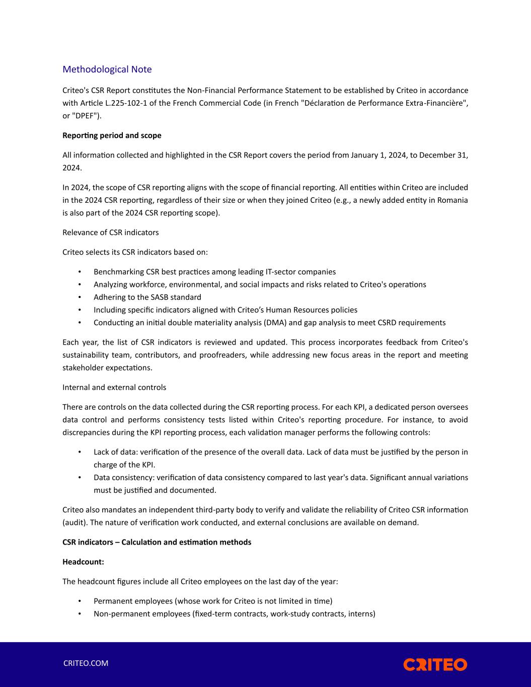CRITEO.COM Methodological Note Criteo's CSR Report constitutes the Non-Financial Performance Statement to be established by Criteo in accordance with Article L.225-102-1 of the French Commercial Code (in French "Déclaration de Performance Extra-Financière", or "DPEF"). Reporting period and scope All information collected and highlighted in the CSR Report covers the period from January 1, 2024, to December 31, 2024. In 2024, the scope of CSR reporting aligns with the scope of financial reporting. All entities within Criteo are included in the 2024 CSR reporting, regardless of their size or when they joined Criteo (e.g., a newly added entity in Romania is also part of the 2024 CSR reporting scope). Relevance of CSR indicators Criteo selects its CSR indicators based on: • Benchmarking CSR best practices among leading IT-sector companies • Analyzing workforce, environmental, and social impacts and risks related to Criteo's operations • Adhering to the SASB standard • Including specific indicators aligned with Criteo’s Human Resources policies • Conducting an initial double materiality analysis (DMA) and gap analysis to meet CSRD requirements Each year, the list of CSR indicators is reviewed and updated. This process incorporates feedback from Criteo's sustainability team, contributors, and proofreaders, while addressing new focus areas in the report and meeting stakeholder expectations. Internal and external controls There are controls on the data collected during the CSR reporting process. For each KPI, a dedicated person oversees data control and performs consistency tests listed within Criteo's reporting procedure. For instance, to avoid discrepancies during the KPI reporting process, each validation manager performs the following controls: • Lack of data: verification of the presence of the overall data. Lack of data must be justified by the person in charge of the KPI. • Data consistency: verification of data consistency compared to last year's data. Significant annual variations must be justified and documented. Criteo also mandates an independent third-party body to verify and validate the reliability of Criteo CSR information (audit). The nature of verification work conducted, and external conclusions are available on demand. CSR indicators – Calculation and estimation methods Headcount: The headcount figures include all Criteo employees on the last day of the year: • Permanent employees (whose work for Criteo is not limited in time) • Non-permanent employees (fixed-term contracts, work-study contracts, interns)