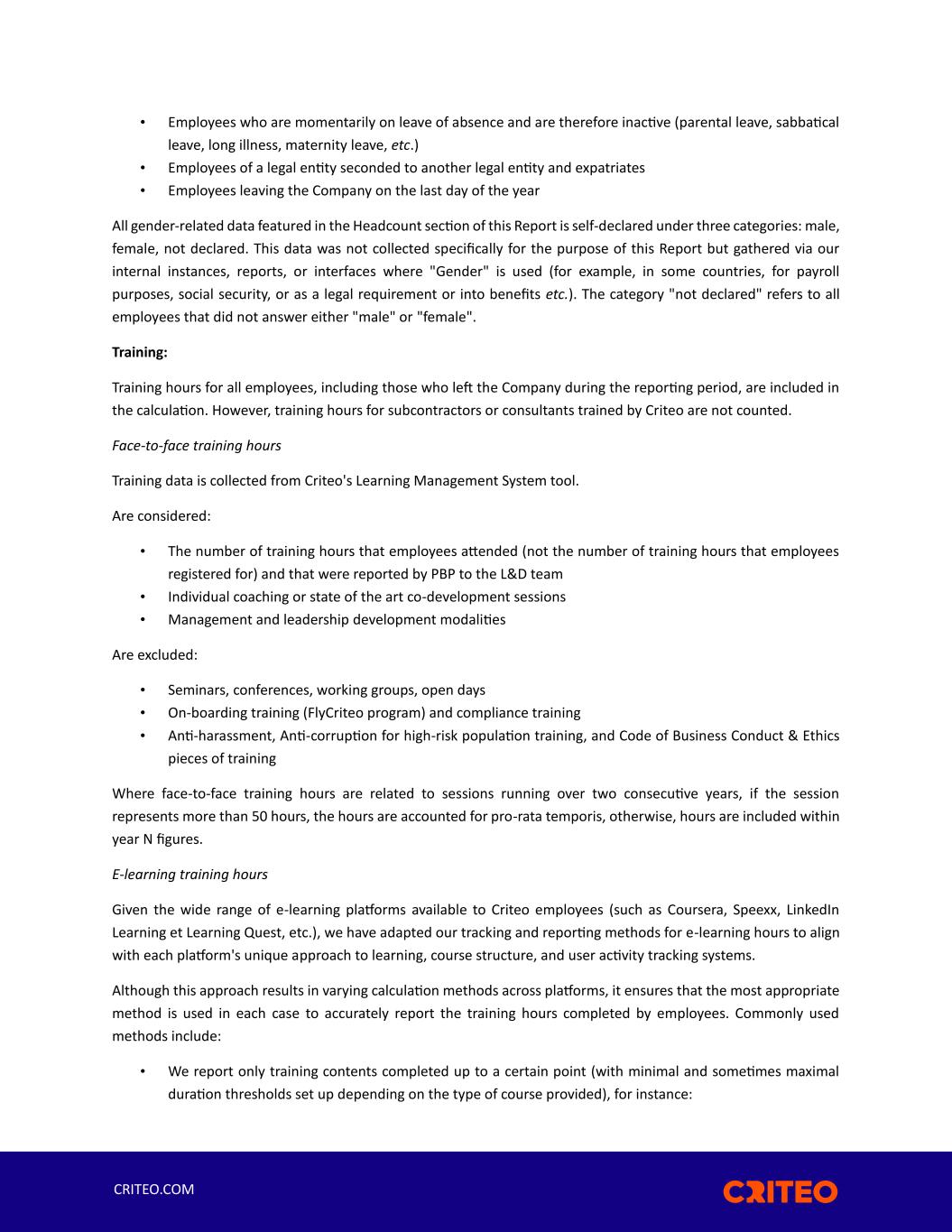 CRITEO.COM • Employees who are momentarily on leave of absence and are therefore inactive (parental leave, sabbatical leave, long illness, maternity leave, etc.) • Employees of a legal entity seconded to another legal entity and expatriates • Employees leaving the Company on the last day of the year All gender-related data featured in the Headcount section of this Report is self-declared under three categories: male, female, not declared. This data was not collected specifically for the purpose of this Report but gathered via our internal instances, reports, or interfaces where "Gender" is used (for example, in some countries, for payroll purposes, social security, or as a legal requirement or into benefits etc.). The category "not declared" refers to all employees that did not answer either "male" or "female". Training: Training hours for all employees, including those who left the Company during the reporting period, are included in the calculation. However, training hours for subcontractors or consultants trained by Criteo are not counted. Face-to-face training hours Training data is collected from Criteo's Learning Management System tool. Are considered: • The number of training hours that employees attended (not the number of training hours that employees registered for) and that were reported by PBP to the L&D team • Individual coaching or state of the art co-development sessions • Management and leadership development modalities Are excluded: • Seminars, conferences, working groups, open days • On-boarding training (FlyCriteo program) and compliance training • Anti-harassment, Anti-corruption for high-risk population training, and Code of Business Conduct & Ethics pieces of training Where face-to-face training hours are related to sessions running over two consecutive years, if the session represents more than 50 hours, the hours are accounted for pro-rata temporis, otherwise, hours are included within year N figures. E-learning training hours Given the wide range of e-learning platforms available to Criteo employees (such as Coursera, Speexx, LinkedIn Learning et Learning Quest, etc.), we have adapted our tracking and reporting methods for e-learning hours to align with each platform's unique approach to learning, course structure, and user activity tracking systems. Although this approach results in varying calculation methods across platforms, it ensures that the most appropriate method is used in each case to accurately report the training hours completed by employees. Commonly used methods include: • We report only training contents completed up to a certain point (with minimal and sometimes maximal duration thresholds set up depending on the type of course provided), for instance: