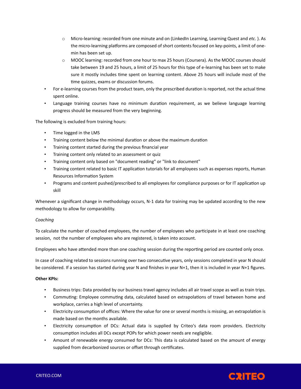 CRITEO.COM o Micro-learning: recorded from one minute and on (LinkedIn Learning, Learning Quest and etc. ). As the micro-learning platforms are composed of short contents focused on key-points, a limit of one- min has been set up. o MOOC learning: recorded from one hour to max 25 hours (Coursera). As the MOOC courses should take between 19 and 25 hours, a limit of 25 hours for this type of e-learning has been set to make sure it mostly includes time spent on learning content. Above 25 hours will include most of the time quizzes, exams or discussion forums. • For e-learning courses from the product team, only the prescribed duration is reported, not the actual time spent online. • Language training courses have no minimum duration requirement, as we believe language learning progress should be measured from the very beginning. The following is excluded from training hours: • Time logged in the LMS • Training content below the minimal duration or above the maximum duration • Training content started during the previous financial year • Training content only related to an assessment or quiz • Training content only based on "document reading" or "link to document" • Training content related to basic IT application tutorials for all employees such as expenses reports, Human Resources Information System • Programs and content pushed/prescribed to all employees for compliance purposes or for IT application up skill Whenever a significant change in methodology occurs, N-1 data for training may be updated according to the new methodology to allow for comparability. Coaching To calculate the number of coached employees, the number of employees who participate in at least one coaching session, not the number of employees who are registered, is taken into account. Employees who have attended more than one coaching session during the reporting period are counted only once. In case of coaching related to sessions running over two consecutive years, only sessions completed in year N should be considered. If a session has started during year N and finishes in year N+1, then it is included in year N+1 figures. Other KPIs: • Business trips: Data provided by our business travel agency includes all air travel scope as well as train trips. • Commuting: Employee commuting data, calculated based on extrapolations of travel between home and workplace, carries a high level of uncertainty. • Electricity consumption of offices: Where the value for one or several months is missing, an extrapolation is made based on the months available. • Electricity consumption of DCs: Actual data is supplied by Criteo's data room providers. Electricity consumption includes all DCs except POPs for which power needs are negligible. • Amount of renewable energy consumed for DCs: This data is calculated based on the amount of energy supplied from decarbonized sources or offset through certificates.