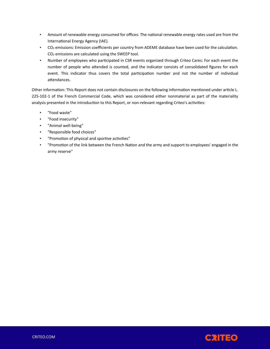 CRITEO.COM • Amount of renewable energy consumed for offices: The national renewable energy rates used are from the International Energy Agency (IAE). • CO2 emissions: Emission coefficients per country from ADEME database have been used for the calculation. CO2 emissions are calculated using the SWEEP tool. • Number of employees who participated in CSR events organized through Criteo Cares: For each event the number of people who attended is counted, and the indicator consists of consolidated figures for each event. This indicator thus covers the total participation number and not the number of individual attendances. Other information: This Report does not contain disclosures on the following information mentioned under article L. 225-102-1 of the French Commercial Code, which was considered either nonmaterial as part of the materiality analysis presented in the introduction to this Report, or non-relevant regarding Criteo's activities: • "Food waste" • "Food insecurity" • "Animal well-being" • "Responsible food choices" • "Promotion of physical and sportive activities" • "Promotion of the link between the French Nation and the army and support to employees' engaged in the army reserve"