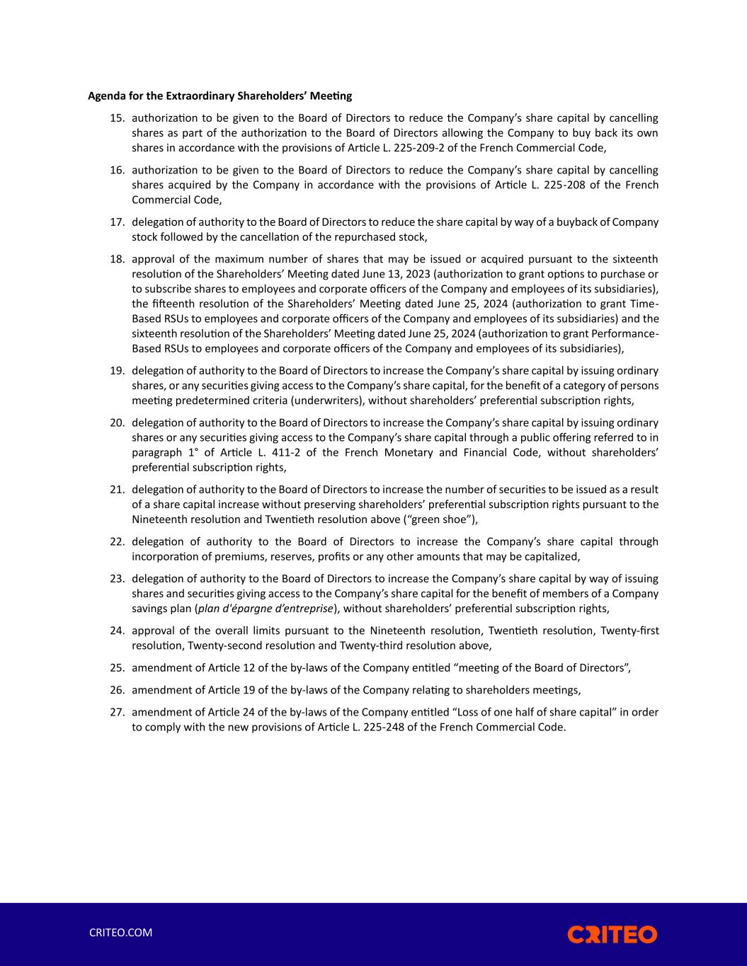 CRITEO.COM Agenda for the Extraordinary Shareholders’ Meeting 15. authorization to be given to the Board of Directors to reduce the Company’s share capital by cancelling shares as part of the authorization to the Board of Directors allowing the Company to buy back its own shares in accordance with the provisions of Article L. 225-209-2 of the French Commercial Code, 16. authorization to be given to the Board of Directors to reduce the Company’s share capital by cancelling shares acquired by the Company in accordance with the provisions of Article L. 225-208 of the French Commercial Code, 17. delegation of authority to the Board of Directors to reduce the share capital by way of a buyback of Company stock followed by the cancellation of the repurchased stock, 18. approval of the maximum number of shares that may be issued or acquired pursuant to the sixteenth resolution of the Shareholders’ Meeting dated June 13, 2023 (authorization to grant options to purchase or to subscribe shares to employees and corporate officers of the Company and employees of its subsidiaries), the fifteenth resolution of the Shareholders’ Meeting dated June 25, 2024 (authorization to grant Time- Based RSUs to employees and corporate officers of the Company and employees of its subsidiaries) and the sixteenth resolution of the Shareholders’ Meeting dated June 25, 2024 (authorization to grant Performance- Based RSUs to employees and corporate officers of the Company and employees of its subsidiaries), 19. delegation of authority to the Board of Directors to increase the Company’s share capital by issuing ordinary shares, or any securities giving access to the Company’s share capital, for the benefit of a category of persons meeting predetermined criteria (underwriters), without shareholders’ preferential subscription rights, 20. delegation of authority to the Board of Directors to increase the Company’s share capital by issuing ordinary shares or any securities giving access to the Company’s share capital through a public offering referred to in paragraph 1° of Article L. 411-2 of the French Monetary and Financial Code, without shareholders’ preferential subscription rights, 21. delegation of authority to the Board of Directors to increase the number of securities to be issued as a result of a share capital increase without preserving shareholders’ preferential subscription rights pursuant to the Nineteenth resolution and Twentieth resolution above (“green shoe”), 22. delegation of authority to the Board of Directors to increase the Company’s share capital through incorporation of premiums, reserves, profits or any other amounts that may be capitalized, 23. delegation of authority to the Board of Directors to increase the Company’s share capital by way of issuing shares and securities giving access to the Company’s share capital for the benefit of members of a Company savings plan (plan d'épargne d’entreprise), without shareholders’ preferential subscription rights, 24. approval of the overall limits pursuant to the Nineteenth resolution, Twentieth resolution, Twenty-first resolution, Twenty-second resolution and Twenty-third resolution above, 25. amendment of Article 12 of the by-laws of the Company entitled “meeting of the Board of Directors”, 26. amendment of Article 19 of the by-laws of the Company relating to shareholders meetings, 27. amendment of Article 24 of the by-laws of the Company entitled “Loss of one half of share capital” in order to comply with the new provisions of Article L. 225-248 of the French Commercial Code.