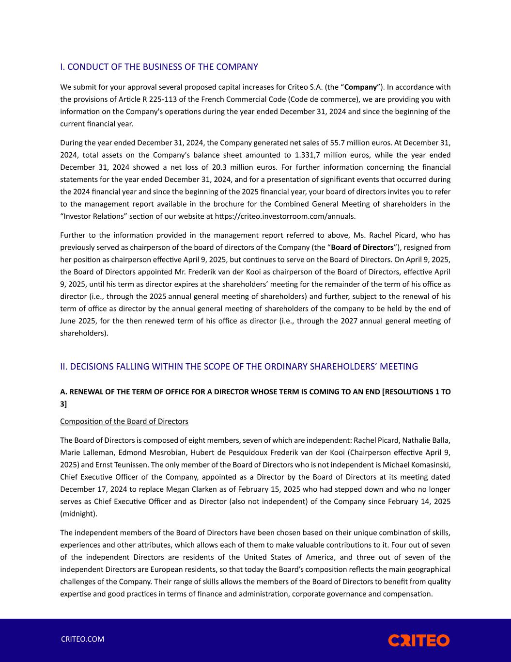 CRITEO.COM I. CONDUCT OF THE BUSINESS OF THE COMPANY We submit for your approval several proposed capital increases for Criteo S.A. (the “Company”). In accordance with the provisions of Article R 225-113 of the French Commercial Code (Code de commerce), we are providing you with information on the Company's operations during the year ended December 31, 2024 and since the beginning of the current financial year. During the year ended December 31, 2024, the Company generated net sales of 55.7 million euros. At December 31, 2024, total assets on the Company's balance sheet amounted to 1.331,7 million euros, while the year ended December 31, 2024 showed a net loss of 20.3 million euros. For further information concerning the financial statements for the year ended December 31, 2024, and for a presentation of significant events that occurred during the 2024 financial year and since the beginning of the 2025 financial year, your board of directors invites you to refer to the management report available in the brochure for the Combined General Meeting of shareholders in the “Investor Relations” section of our website at https://criteo.investorroom.com/annuals. Further to the information provided in the management report referred to above, Ms. Rachel Picard, who has previously served as chairperson of the board of directors of the Company (the “Board of Directors”), resigned from her position as chairperson effective April 9, 2025, but continues to serve on the Board of Directors. On April 9, 2025, the Board of Directors appointed Mr. Frederik van der Kooi as chairperson of the Board of Directors, effective April 9, 2025, until his term as director expires at the shareholders’ meeting for the remainder of the term of his office as director (i.e., through the 2025 annual general meeting of shareholders) and further, subject to the renewal of his term of office as director by the annual general meeting of shareholders of the company to be held by the end of June 2025, for the then renewed term of his office as director (i.e., through the 2027 annual general meeting of shareholders). II. DECISIONS FALLING WITHIN THE SCOPE OF THE ORDINARY SHAREHOLDERS’ MEETING A. RENEWAL OF THE TERM OF OFFICE FOR A DIRECTOR WHOSE TERM IS COMING TO AN END [RESOLUTIONS 1 TO 3] Composition of the Board of Directors The Board of Directors is composed of eight members, seven of which are independent: Rachel Picard, Nathalie Balla, Marie Lalleman, Edmond Mesrobian, Hubert de Pesquidoux Frederik van der Kooi (Chairperson effective April 9, 2025) and Ernst Teunissen. The only member of the Board of Directors who is not independent is Michael Komasinski, Chief Executive Officer of the Company, appointed as a Director by the Board of Directors at its meeting dated December 17, 2024 to replace Megan Clarken as of February 15, 2025 who had stepped down and who no longer serves as Chief Executive Officer and as Director (also not independent) of the Company since February 14, 2025 (midnight). The independent members of the Board of Directors have been chosen based on their unique combination of skills, experiences and other attributes, which allows each of them to make valuable contributions to it. Four out of seven of the independent Directors are residents of the United States of America, and three out of seven of the independent Directors are European residents, so that today the Board’s composition reflects the main geographical challenges of the Company. Their range of skills allows the members of the Board of Directors to benefit from quality expertise and good practices in terms of finance and administration, corporate governance and compensation.