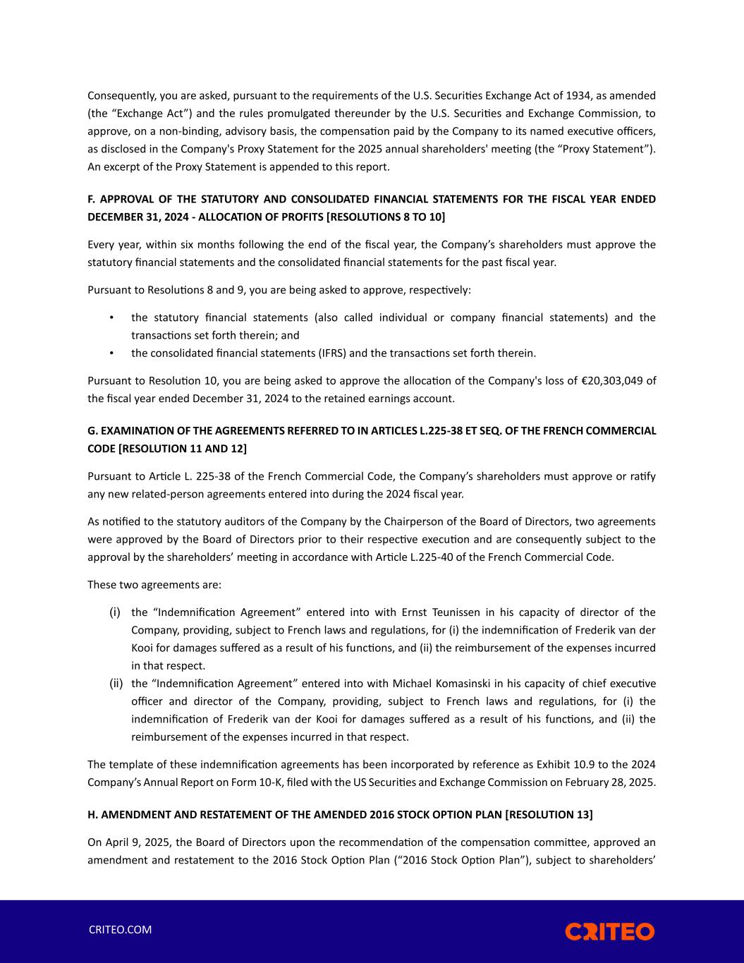CRITEO.COM Consequently, you are asked, pursuant to the requirements of the U.S. Securities Exchange Act of 1934, as amended (the “Exchange Act”) and the rules promulgated thereunder by the U.S. Securities and Exchange Commission, to approve, on a non-binding, advisory basis, the compensation paid by the Company to its named executive officers, as disclosed in the Company's Proxy Statement for the 2025 annual shareholders' meeting (the “Proxy Statement”). An excerpt of the Proxy Statement is appended to this report. F. APPROVAL OF THE STATUTORY AND CONSOLIDATED FINANCIAL STATEMENTS FOR THE FISCAL YEAR ENDED DECEMBER 31, 2024 - ALLOCATION OF PROFITS [RESOLUTIONS 8 TO 10] Every year, within six months following the end of the fiscal year, the Company’s shareholders must approve the statutory financial statements and the consolidated financial statements for the past fiscal year. Pursuant to Resolutions 8 and 9, you are being asked to approve, respectively: • the statutory financial statements (also called individual or company financial statements) and the transactions set forth therein; and • the consolidated financial statements (IFRS) and the transactions set forth therein. Pursuant to Resolution 10, you are being asked to approve the allocation of the Company's loss of €20,303,049 of the fiscal year ended December 31, 2024 to the retained earnings account. G. EXAMINATION OF THE AGREEMENTS REFERRED TO IN ARTICLES L.225-38 ET SEQ. OF THE FRENCH COMMERCIAL CODE [RESOLUTION 11 AND 12] Pursuant to Article L. 225-38 of the French Commercial Code, the Company’s shareholders must approve or ratify any new related-person agreements entered into during the 2024 fiscal year. As notified to the statutory auditors of the Company by the Chairperson of the Board of Directors, two agreements were approved by the Board of Directors prior to their respective execution and are consequently subject to the approval by the shareholders’ meeting in accordance with Article L.225-40 of the French Commercial Code. These two agreements are: (i) the “Indemnification Agreement” entered into with Ernst Teunissen in his capacity of director of the Company, providing, subject to French laws and regulations, for (i) the indemnification of Frederik van der Kooi for damages suffered as a result of his functions, and (ii) the reimbursement of the expenses incurred in that respect. (ii) the “Indemnification Agreement” entered into with Michael Komasinski in his capacity of chief executive officer and director of the Company, providing, subject to French laws and regulations, for (i) the indemnification of Frederik van der Kooi for damages suffered as a result of his functions, and (ii) the reimbursement of the expenses incurred in that respect. The template of these indemnification agreements has been incorporated by reference as Exhibit 10.9 to the 2024 Company’s Annual Report on Form 10-K, filed with the US Securities and Exchange Commission on February 28, 2025. H. AMENDMENT AND RESTATEMENT OF THE AMENDED 2016 STOCK OPTION PLAN [RESOLUTION 13] On April 9, 2025, the Board of Directors upon the recommendation of the compensation committee, approved an amendment and restatement to the 2016 Stock Option Plan (“2016 Stock Option Plan”), subject to shareholders’