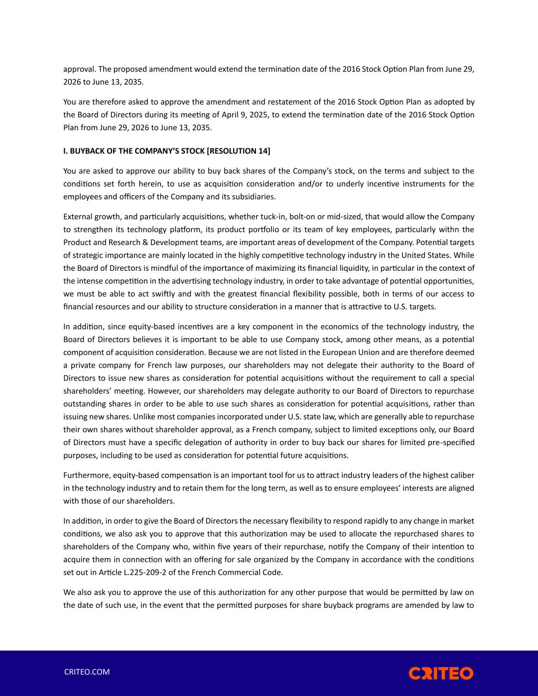 CRITEO.COM approval. The proposed amendment would extend the termination date of the 2016 Stock Option Plan from June 29, 2026 to June 13, 2035. You are therefore asked to approve the amendment and restatement of the 2016 Stock Option Plan as adopted by the Board of Directors during its meeting of April 9, 2025, to extend the termination date of the 2016 Stock Option Plan from June 29, 2026 to June 13, 2035. I. BUYBACK OF THE COMPANY’S STOCK [RESOLUTION 14] You are asked to approve our ability to buy back shares of the Company’s stock, on the terms and subject to the conditions set forth herein, to use as acquisition consideration and/or to underly incentive instruments for the employees and officers of the Company and its subsidiaries. External growth, and particularly acquisitions, whether tuck-in, bolt-on or mid-sized, that would allow the Company to strengthen its technology platform, its product portfolio or its team of key employees, particularly withn the Product and Research & Development teams, are important areas of development of the Company. Potential targets of strategic importance are mainly located in the highly competitive technology industry in the United States. While the Board of Directors is mindful of the importance of maximizing its financial liquidity, in particular in the context of the intense competition in the advertising technology industry, in order to take advantage of potential opportunities, we must be able to act swiftly and with the greatest financial flexibility possible, both in terms of our access to financial resources and our ability to structure consideration in a manner that is attractive to U.S. targets. In addition, since equity-based incentives are a key component in the economics of the technology industry, the Board of Directors believes it is important to be able to use Company stock, among other means, as a potential component of acquisition consideration. Because we are not listed in the European Union and are therefore deemed a private company for French law purposes, our shareholders may not delegate their authority to the Board of Directors to issue new shares as consideration for potential acquisitions without the requirement to call a special shareholders’ meeting. However, our shareholders may delegate authority to our Board of Directors to repurchase outstanding shares in order to be able to use such shares as consideration for potential acquisitions, rather than issuing new shares. Unlike most companies incorporated under U.S. state law, which are generally able to repurchase their own shares without shareholder approval, as a French company, subject to limited exceptions only, our Board of Directors must have a specific delegation of authority in order to buy back our shares for limited pre-specified purposes, including to be used as consideration for potential future acquisitions. Furthermore, equity-based compensation is an important tool for us to attract industry leaders of the highest caliber in the technology industry and to retain them for the long term, as well as to ensure employees’ interests are aligned with those of our shareholders. In addition, in order to give the Board of Directors the necessary flexibility to respond rapidly to any change in market conditions, we also ask you to approve that this authorization may be used to allocate the repurchased shares to shareholders of the Company who, within five years of their repurchase, notify the Company of their intention to acquire them in connection with an offering for sale organized by the Company in accordance with the conditions set out in Article L.225-209-2 of the French Commercial Code. We also ask you to approve the use of this authorization for any other purpose that would be permitted by law on the date of such use, in the event that the permitted purposes for share buyback programs are amended by law to