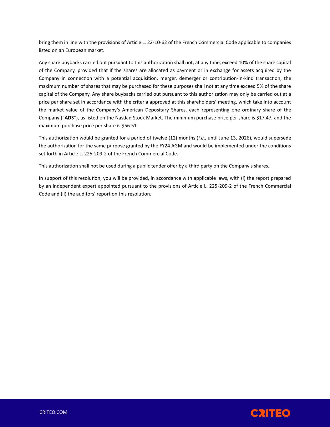 CRITEO.COM bring them in line with the provisions of Article L. 22-10-62 of the French Commercial Code applicable to companies listed on an European market. Any share buybacks carried out pursuant to this authorization shall not, at any time, exceed 10% of the share capital of the Company, provided that if the shares are allocated as payment or in exchange for assets acquired by the Company in connection with a potential acquisition, merger, demerger or contribution-in-kind transaction, the maximum number of shares that may be purchased for these purposes shall not at any time exceed 5% of the share capital of the Company. Any share buybacks carried out pursuant to this authorization may only be carried out at a price per share set in accordance with the criteria approved at this shareholders’ meeting, which take into account the market value of the Company’s American Depositary Shares, each representing one ordinary share of the Company (“ADS”), as listed on the Nasdaq Stock Market. The minimum purchase price per share is $17.47, and the maximum purchase price per share is $56.51. This authorization would be granted for a period of twelve (12) months (i.e., until June 13, 2026), would supersede the authorization for the same purpose granted by the FY24 AGM and would be implemented under the conditions set forth in Article L. 225-209-2 of the French Commercial Code. This authorization shall not be used during a public tender offer by a third party on the Company's shares. In support of this resolution, you will be provided, in accordance with applicable laws, with (i) the report prepared by an independent expert appointed pursuant to the provisions of Article L. 225-209-2 of the French Commercial Code and (ii) the auditors' report on this resolution.