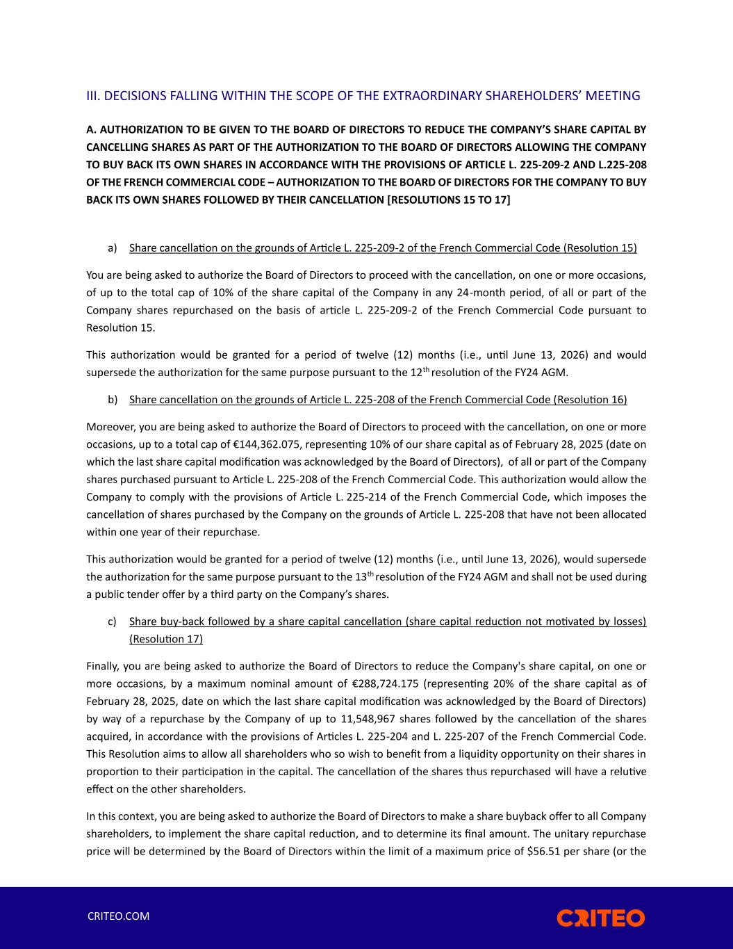 CRITEO.COM III. DECISIONS FALLING WITHIN THE SCOPE OF THE EXTRAORDINARY SHAREHOLDERS’ MEETING A. AUTHORIZATION TO BE GIVEN TO THE BOARD OF DIRECTORS TO REDUCE THE COMPANY’S SHARE CAPITAL BY CANCELLING SHARES AS PART OF THE AUTHORIZATION TO THE BOARD OF DIRECTORS ALLOWING THE COMPANY TO BUY BACK ITS OWN SHARES IN ACCORDANCE WITH THE PROVISIONS OF ARTICLE L. 225-209-2 AND L.225-208 OF THE FRENCH COMMERCIAL CODE – AUTHORIZATION TO THE BOARD OF DIRECTORS FOR THE COMPANY TO BUY BACK ITS OWN SHARES FOLLOWED BY THEIR CANCELLATION [RESOLUTIONS 15 TO 17] a) Share cancellation on the grounds of Article L. 225-209-2 of the French Commercial Code (Resolution 15) You are being asked to authorize the Board of Directors to proceed with the cancellation, on one or more occasions, of up to the total cap of 10% of the share capital of the Company in any 24-month period, of all or part of the Company shares repurchased on the basis of article L. 225-209-2 of the French Commercial Code pursuant to Resolution 15. This authorization would be granted for a period of twelve (12) months (i.e., until June 13, 2026) and would supersede the authorization for the same purpose pursuant to the 12th resolution of the FY24 AGM. b) Share cancellation on the grounds of Article L. 225-208 of the French Commercial Code (Resolution 16) Moreover, you are being asked to authorize the Board of Directors to proceed with the cancellation, on one or more occasions, up to a total cap of €144,362.075, representing 10% of our share capital as of February 28, 2025 (date on which the last share capital modification was acknowledged by the Board of Directors), of all or part of the Company shares purchased pursuant to Article L. 225-208 of the French Commercial Code. This authorization would allow the Company to comply with the provisions of Article L. 225-214 of the French Commercial Code, which imposes the cancellation of shares purchased by the Company on the grounds of Article L. 225-208 that have not been allocated within one year of their repurchase. This authorization would be granted for a period of twelve (12) months (i.e., until June 13, 2026), would supersede the authorization for the same purpose pursuant to the 13th resolution of the FY24 AGM and shall not be used during a public tender offer by a third party on the Company’s shares. c) Share buy-back followed by a share capital cancellation (share capital reduction not motivated by losses) (Resolution 17) Finally, you are being asked to authorize the Board of Directors to reduce the Company's share capital, on one or more occasions, by a maximum nominal amount of €288,724.175 (representing 20% of the share capital as of February 28, 2025, date on which the last share capital modification was acknowledged by the Board of Directors) by way of a repurchase by the Company of up to 11,548,967 shares followed by the cancellation of the shares acquired, in accordance with the provisions of Articles L. 225-204 and L. 225-207 of the French Commercial Code. This Resolution aims to allow all shareholders who so wish to benefit from a liquidity opportunity on their shares in proportion to their participation in the capital. The cancellation of the shares thus repurchased will have a relutive effect on the other shareholders. In this context, you are being asked to authorize the Board of Directors to make a share buyback offer to all Company shareholders, to implement the share capital reduction, and to determine its final amount. The unitary repurchase price will be determined by the Board of Directors within the limit of a maximum price of $56.51 per share (or the