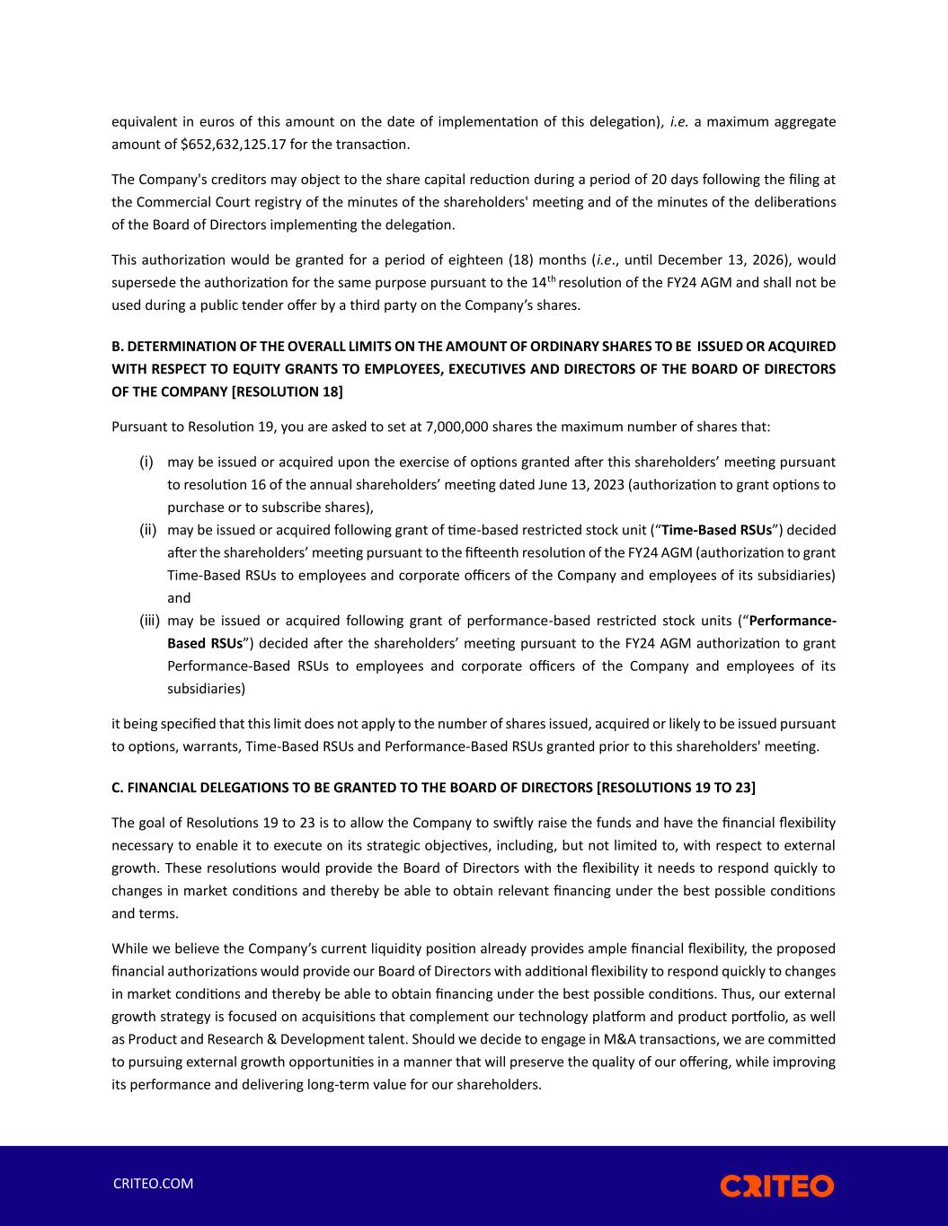 CRITEO.COM equivalent in euros of this amount on the date of implementation of this delegation), i.e. a maximum aggregate amount of $652,632,125.17 for the transaction. The Company's creditors may object to the share capital reduction during a period of 20 days following the filing at the Commercial Court registry of the minutes of the shareholders' meeting and of the minutes of the deliberations of the Board of Directors implementing the delegation. This authorization would be granted for a period of eighteen (18) months (i.e., until December 13, 2026), would supersede the authorization for the same purpose pursuant to the 14th resolution of the FY24 AGM and shall not be used during a public tender offer by a third party on the Company’s shares. B. DETERMINATION OF THE OVERALL LIMITS ON THE AMOUNT OF ORDINARY SHARES TO BE ISSUED OR ACQUIRED WITH RESPECT TO EQUITY GRANTS TO EMPLOYEES, EXECUTIVES AND DIRECTORS OF THE BOARD OF DIRECTORS OF THE COMPANY [RESOLUTION 18] Pursuant to Resolution 19, you are asked to set at 7,000,000 shares the maximum number of shares that: (i) may be issued or acquired upon the exercise of options granted after this shareholders’ meeting pursuant to resolution 16 of the annual shareholders’ meeting dated June 13, 2023 (authorization to grant options to purchase or to subscribe shares), (ii) may be issued or acquired following grant of time-based restricted stock unit (“Time-Based RSUs”) decided after the shareholders’ meeting pursuant to the fifteenth resolution of the FY24 AGM (authorization to grant Time-Based RSUs to employees and corporate officers of the Company and employees of its subsidiaries) and (iii) may be issued or acquired following grant of performance-based restricted stock units (“Performance- Based RSUs”) decided after the shareholders’ meeting pursuant to the FY24 AGM authorization to grant Performance-Based RSUs to employees and corporate officers of the Company and employees of its subsidiaries) it being specified that this limit does not apply to the number of shares issued, acquired or likely to be issued pursuant to options, warrants, Time-Based RSUs and Performance-Based RSUs granted prior to this shareholders' meeting. C. FINANCIAL DELEGATIONS TO BE GRANTED TO THE BOARD OF DIRECTORS [RESOLUTIONS 19 TO 23] The goal of Resolutions 19 to 23 is to allow the Company to swiftly raise the funds and have the financial flexibility necessary to enable it to execute on its strategic objectives, including, but not limited to, with respect to external growth. These resolutions would provide the Board of Directors with the flexibility it needs to respond quickly to changes in market conditions and thereby be able to obtain relevant financing under the best possible conditions and terms. While we believe the Company’s current liquidity position already provides ample financial flexibility, the proposed financial authorizations would provide our Board of Directors with additional flexibility to respond quickly to changes in market conditions and thereby be able to obtain financing under the best possible conditions. Thus, our external growth strategy is focused on acquisitions that complement our technology platform and product portfolio, as well as Product and Research & Development talent. Should we decide to engage in M&A transactions, we are committed to pursuing external growth opportunities in a manner that will preserve the quality of our offering, while improving its performance and delivering long-term value for our shareholders.