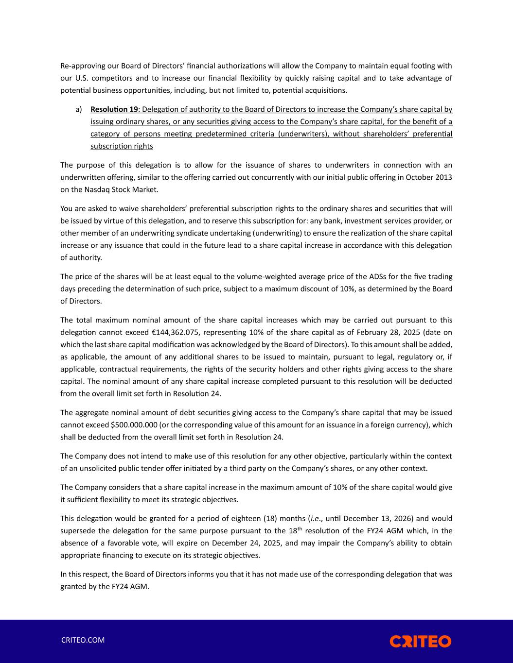 CRITEO.COM Re-approving our Board of Directors’ financial authorizations will allow the Company to maintain equal footing with our U.S. competitors and to increase our financial flexibility by quickly raising capital and to take advantage of potential business opportunities, including, but not limited to, potential acquisitions. a) Resolution 19: Delegation of authority to the Board of Directors to increase the Company’s share capital by issuing ordinary shares, or any securities giving access to the Company’s share capital, for the benefit of a category of persons meeting predetermined criteria (underwriters), without shareholders’ preferential subscription rights The purpose of this delegation is to allow for the issuance of shares to underwriters in connection with an underwritten offering, similar to the offering carried out concurrently with our initial public offering in October 2013 on the Nasdaq Stock Market. You are asked to waive shareholders’ preferential subscription rights to the ordinary shares and securities that will be issued by virtue of this delegation, and to reserve this subscription for: any bank, investment services provider, or other member of an underwriting syndicate undertaking (underwriting) to ensure the realization of the share capital increase or any issuance that could in the future lead to a share capital increase in accordance with this delegation of authority. The price of the shares will be at least equal to the volume-weighted average price of the ADSs for the five trading days preceding the determination of such price, subject to a maximum discount of 10%, as determined by the Board of Directors. The total maximum nominal amount of the share capital increases which may be carried out pursuant to this delegation cannot exceed €144,362.075, representing 10% of the share capital as of February 28, 2025 (date on which the last share capital modification was acknowledged by the Board of Directors). To this amount shall be added, as applicable, the amount of any additional shares to be issued to maintain, pursuant to legal, regulatory or, if applicable, contractual requirements, the rights of the security holders and other rights giving access to the share capital. The nominal amount of any share capital increase completed pursuant to this resolution will be deducted from the overall limit set forth in Resolution 24. The aggregate nominal amount of debt securities giving access to the Company’s share capital that may be issued cannot exceed $500.000.000 (or the corresponding value of this amount for an issuance in a foreign currency), which shall be deducted from the overall limit set forth in Resolution 24. The Company does not intend to make use of this resolution for any other objective, particularly within the context of an unsolicited public tender offer initiated by a third party on the Company’s shares, or any other context. The Company considers that a share capital increase in the maximum amount of 10% of the share capital would give it sufficient flexibility to meet its strategic objectives. This delegation would be granted for a period of eighteen (18) months (i.e., until December 13, 2026) and would supersede the delegation for the same purpose pursuant to the 18th resolution of the FY24 AGM which, in the absence of a favorable vote, will expire on December 24, 2025, and may impair the Company’s ability to obtain appropriate financing to execute on its strategic objectives. In this respect, the Board of Directors informs you that it has not made use of the corresponding delegation that was granted by the FY24 AGM.