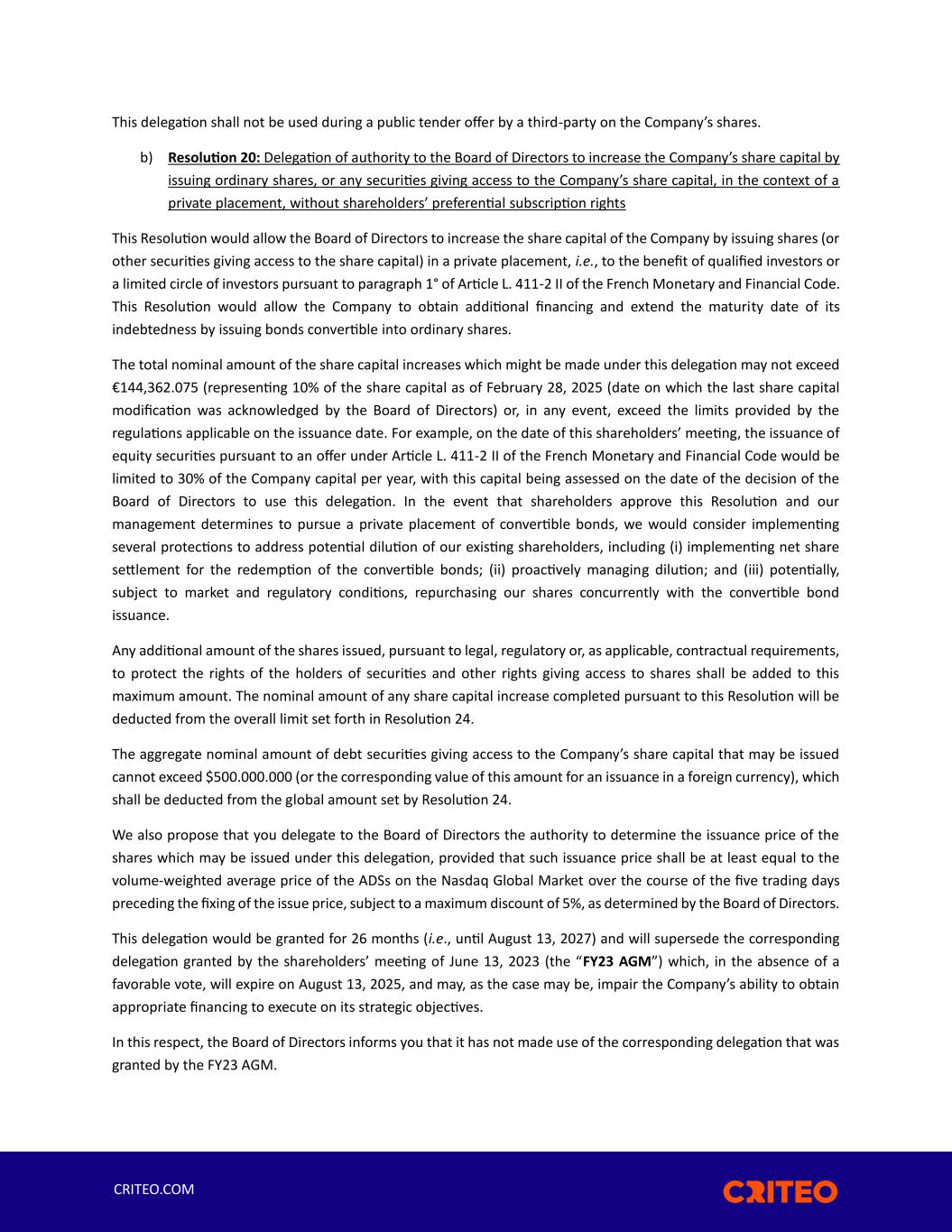 CRITEO.COM This delegation shall not be used during a public tender offer by a third-party on the Company’s shares. b) Resolution 20: Delegation of authority to the Board of Directors to increase the Company’s share capital by issuing ordinary shares, or any securities giving access to the Company’s share capital, in the context of a private placement, without shareholders’ preferential subscription rights This Resolution would allow the Board of Directors to increase the share capital of the Company by issuing shares (or other securities giving access to the share capital) in a private placement, i.e., to the benefit of qualified investors or a limited circle of investors pursuant to paragraph 1° of Article L. 411-2 II of the French Monetary and Financial Code. This Resolution would allow the Company to obtain additional financing and extend the maturity date of its indebtedness by issuing bonds convertible into ordinary shares. The total nominal amount of the share capital increases which might be made under this delegation may not exceed €144,362.075 (representing 10% of the share capital as of February 28, 2025 (date on which the last share capital modification was acknowledged by the Board of Directors) or, in any event, exceed the limits provided by the regulations applicable on the issuance date. For example, on the date of this shareholders’ meeting, the issuance of equity securities pursuant to an offer under Article L. 411-2 II of the French Monetary and Financial Code would be limited to 30% of the Company capital per year, with this capital being assessed on the date of the decision of the Board of Directors to use this delegation. In the event that shareholders approve this Resolution and our management determines to pursue a private placement of convertible bonds, we would consider implementing several protections to address potential dilution of our existing shareholders, including (i) implementing net share settlement for the redemption of the convertible bonds; (ii) proactively managing dilution; and (iii) potentially, subject to market and regulatory conditions, repurchasing our shares concurrently with the convertible bond issuance. Any additional amount of the shares issued, pursuant to legal, regulatory or, as applicable, contractual requirements, to protect the rights of the holders of securities and other rights giving access to shares shall be added to this maximum amount. The nominal amount of any share capital increase completed pursuant to this Resolution will be deducted from the overall limit set forth in Resolution 24. The aggregate nominal amount of debt securities giving access to the Company’s share capital that may be issued cannot exceed $500.000.000 (or the corresponding value of this amount for an issuance in a foreign currency), which shall be deducted from the global amount set by Resolution 24. We also propose that you delegate to the Board of Directors the authority to determine the issuance price of the shares which may be issued under this delegation, provided that such issuance price shall be at least equal to the volume-weighted average price of the ADSs on the Nasdaq Global Market over the course of the five trading days preceding the fixing of the issue price, subject to a maximum discount of 5%, as determined by the Board of Directors. This delegation would be granted for 26 months (i.e., until August 13, 2027) and will supersede the corresponding delegation granted by the shareholders’ meeting of June 13, 2023 (the “FY23 AGM”) which, in the absence of a favorable vote, will expire on August 13, 2025, and may, as the case may be, impair the Company’s ability to obtain appropriate financing to execute on its strategic objectives. In this respect, the Board of Directors informs you that it has not made use of the corresponding delegation that was granted by the FY23 AGM.